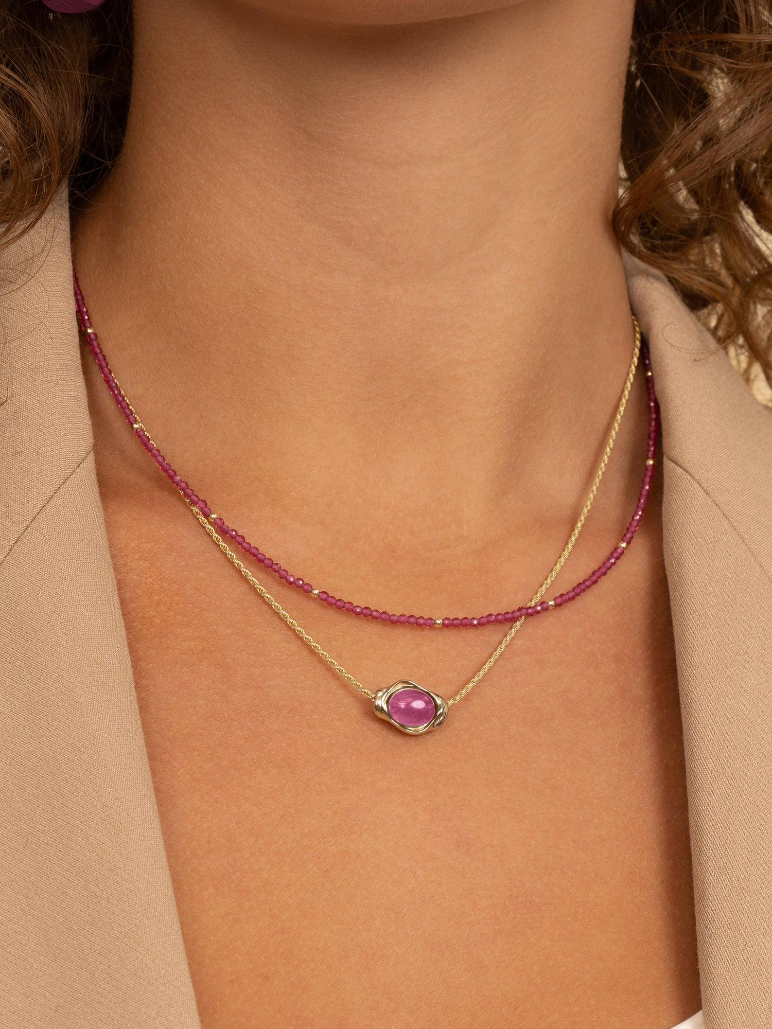 Kralen Ketting 2mm Candy Jade 42cm +2cm. Deze ketting brengt kleur en subtiliteit samen. De 2 mm kralen laten Candy Jade helder spreken, terwijl de verstelbare lengte eenvoudig afstemt op je halslijn. Draag solo voor minimalistische elegantie, of bouw een gelaagde set met een schakelketting en een subtiele hanger. De candykleur harmonieert met goud en zilver en geeft neutrale outfits een frisse gloed. Naast denim en wit ontstaat een speelse balans, bij zwart een modern contrast. De gladde afwerking voelt prettig op de huid en blijft comfortabel tijdens lange dagen. Laat de kleur zacht terugkomen in studs of een ring voor een persoonlijke, samenhangende set.