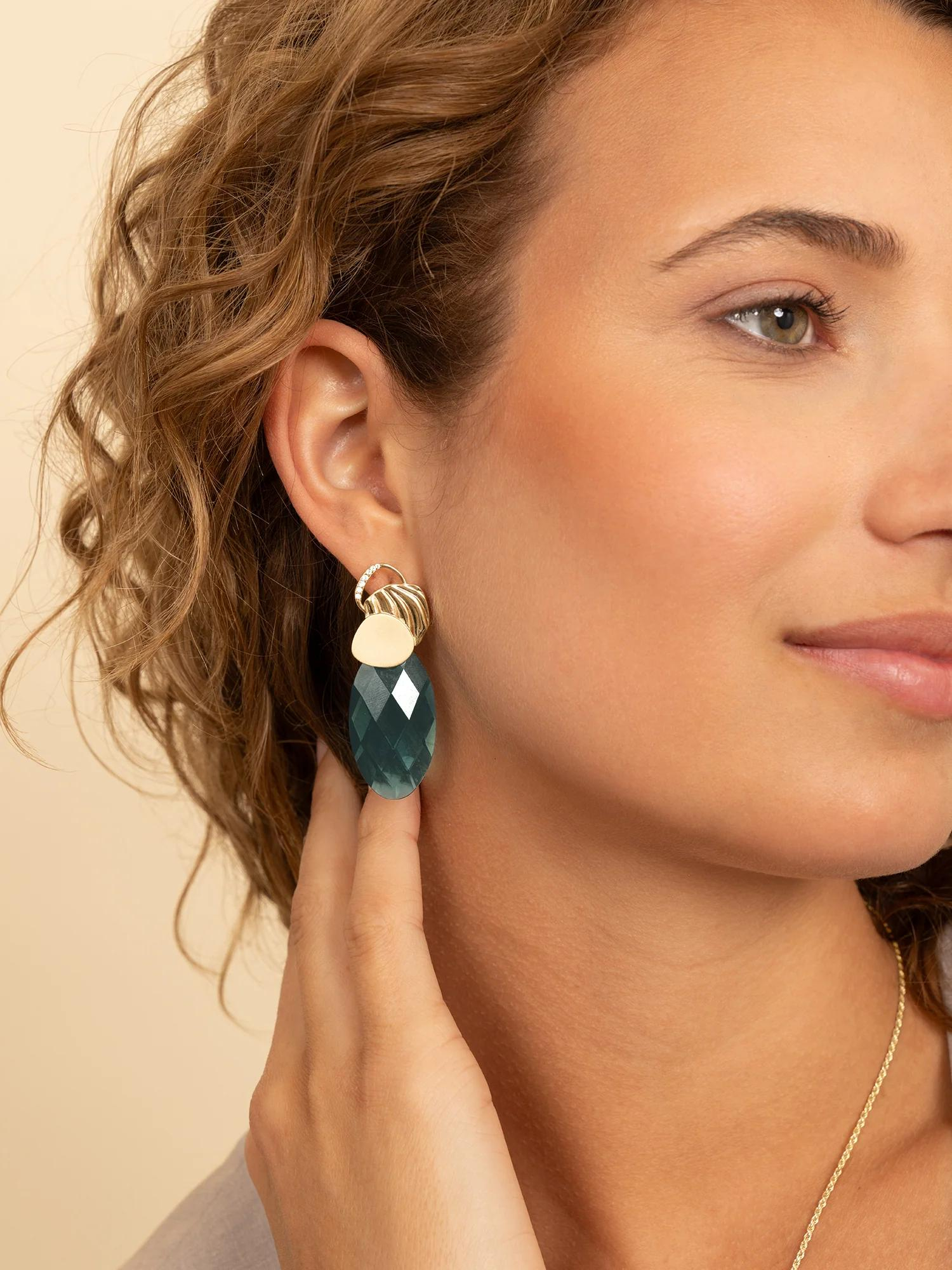 Oorbel Edelstenen Large Leaf Turquoise Quartz. Het ontwerp laat de Turquoise Quartz centraal schitteren, zonder afleiding. De levendige tint vangt het licht en omlijst je gezicht met een frisse gloed. Dankzij het lichte draaggevoel blijven de oorbellen comfortabel, van meeting tot diner. Draag ze solo als helder focuspunt, of mix met kleine studs voor een gelaagde ear stack. De kleur harmonieert met zilver en witgoud, en geeft denim, wit en grijs een moderne lift. Naast zwart ontstaat een elegant contrast. De afwerking is glad en zorgvuldig, zodat je ze zorgeloos vaak kunt dragen. Een tijdloze keuze wanneer je je dagelijkse stijl wilt verrijken met een persoonlijk kleuraccent dat seizoenen overstijgt en elke dag rustig laat stralen.