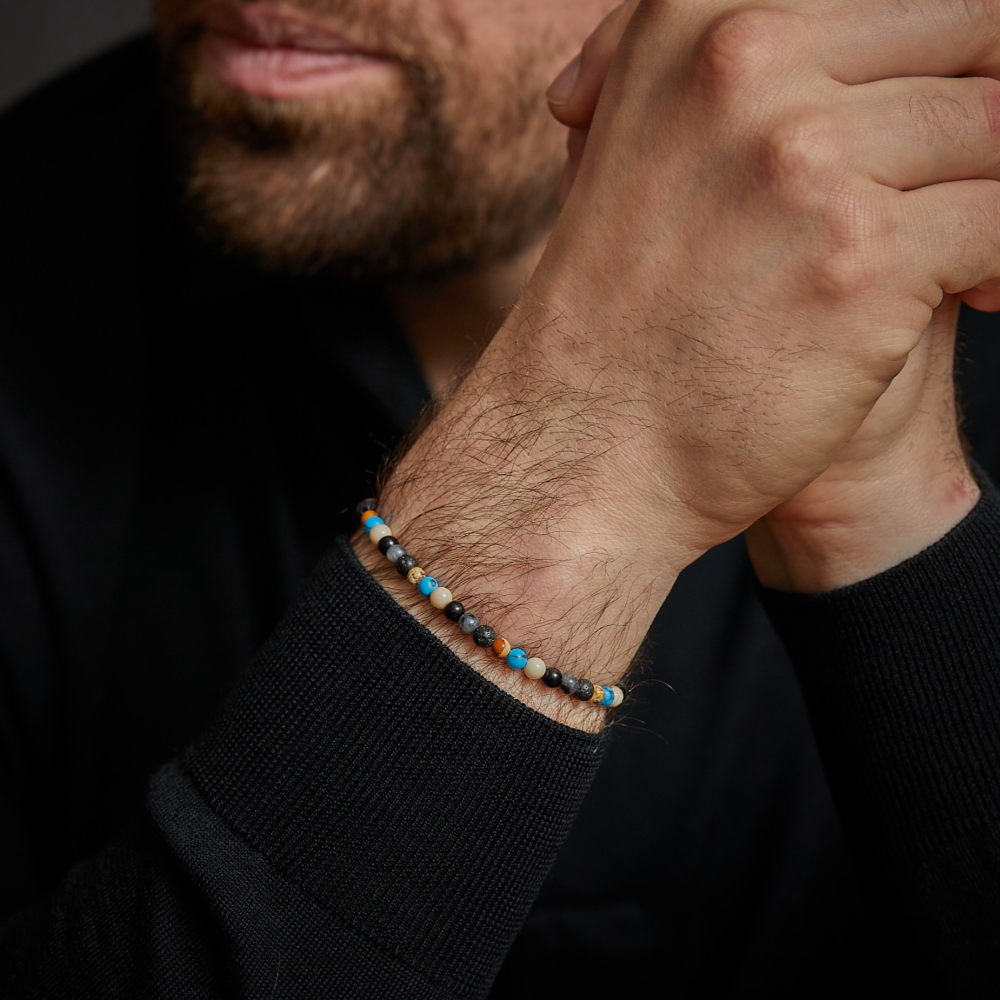 Bead armband, handgemaakt van 4mm zwarte Lava stenen en edelstenen Agaat, Larvikiet, Lithographic, Turkoois en Fossil met een zilverkleurig slot. Het Rebel & Rose sieraad is makkelijk te combineren met andere zilveren, leren of kralenarmbanden.