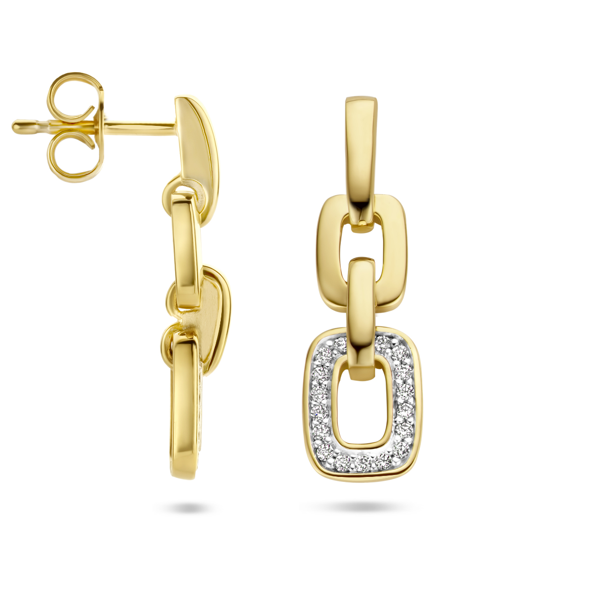 14k Geelgouden oorhangers met een totale hoogte van 23mm. Uitgevoerd met schitterende diamanten.