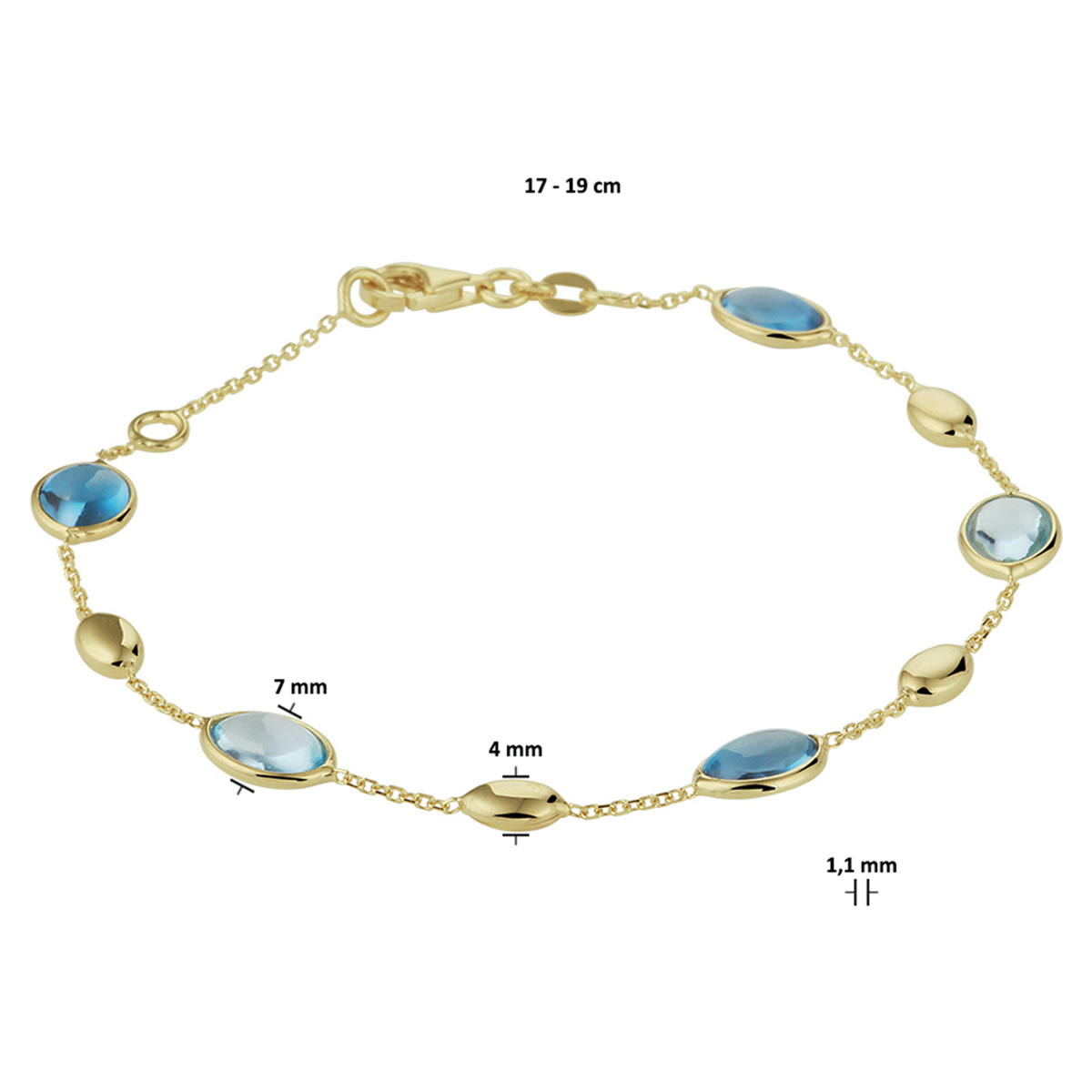 14k Geelgouden anker armband uitgevoerd met de schitterende edelstenen London blue topaas en blauw topaas. De armband heeft draaglengtes van 17 en 19cm en een stevige karabijn sluiting. De schakelbreedte is 1.1mm.