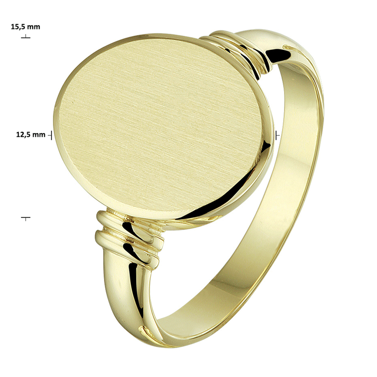 Stijlvolle geelgouden massieve graveerring met een afmeting van 15.5x12.5mm. De gediamanteerde afwerking en de robuuste afkanting maken de ring helemaal af.