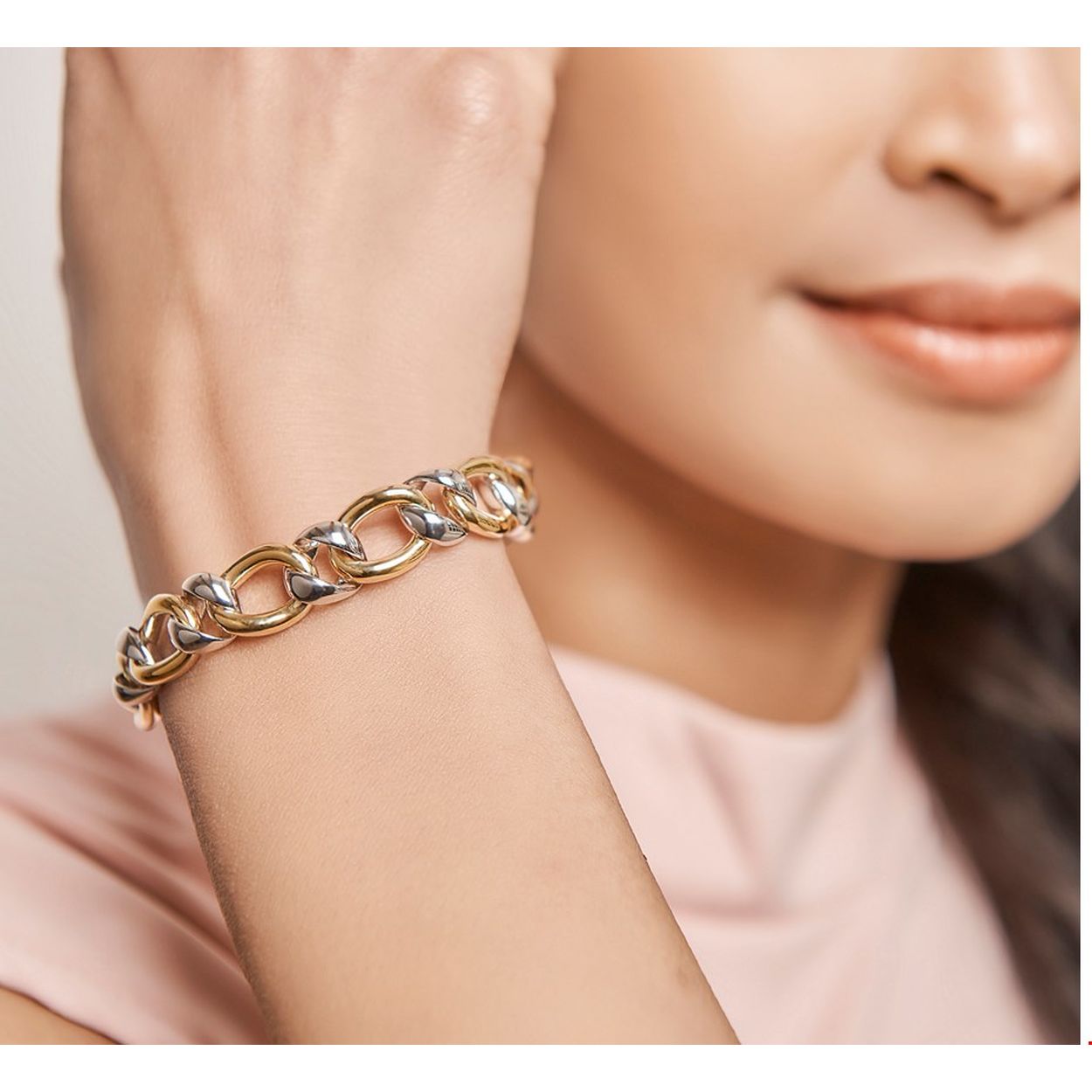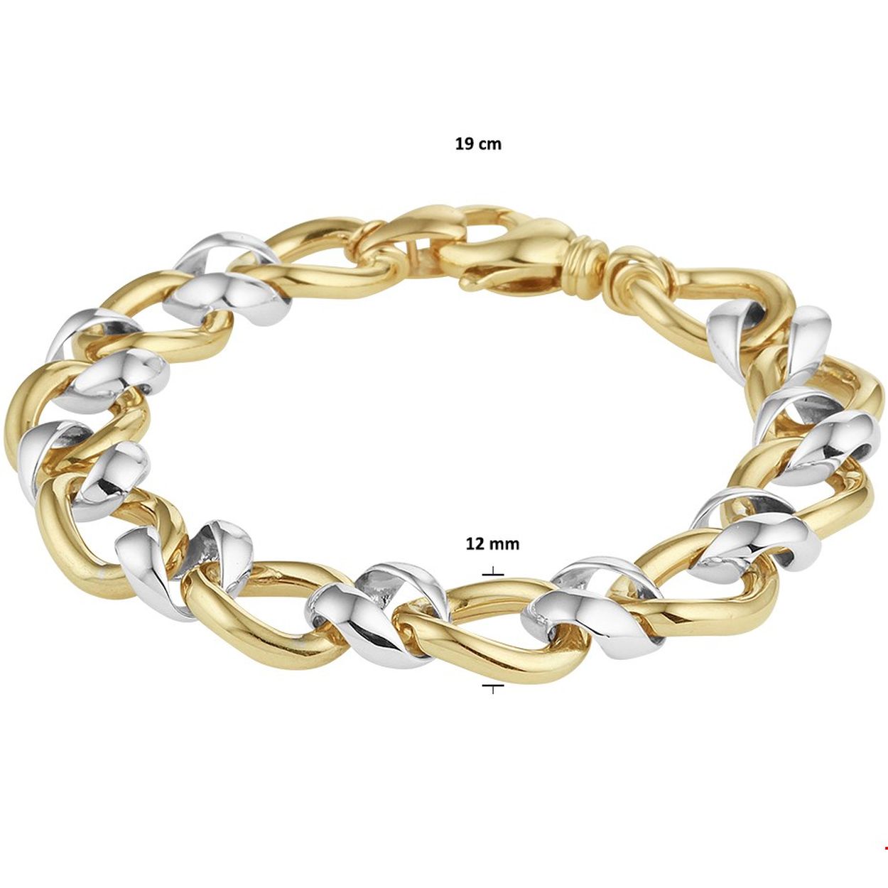 Een opvallende bicolor armband van 14k geel- en witgoud. De geelgouden gourmetschakels zijn iets groter dan de witgouden, wat de armband een speels uiterlijk geeft. De breedte van de schakel is 12mm, en de lengte van de armband is 19 cm. De armband sluit met een stevige karabijnsluiting.