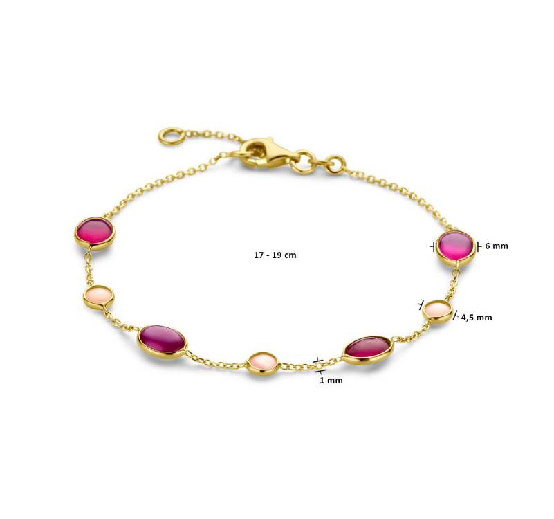 14k Geelgouden armband uitgevoerd met roze opaal en robijn. De armband heeft een schakelbreedte van 1mm en draaglengtes van 17-19cm. Uitgevoerd met karabijn sluiting.
