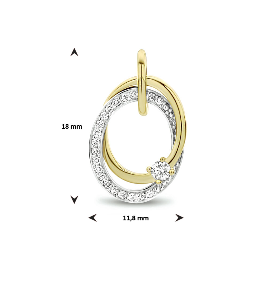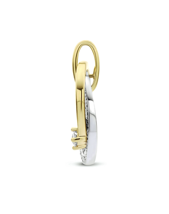 14 Karaat bicolor geel- en witgouden hanger uitgevoerd met 0.14 caraat schitterend diamant H/SI. De hanger heeft een totale hoogte van 1.8cm en een breedte van 11.8mm.