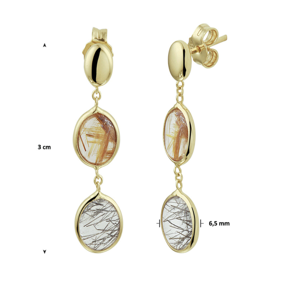 Met deze lange oorhangers met edelstenen maak je je outfit af! De twee edelstenen zijn van gouden en zwarte rutiel kwarts. De totale lengte van de hanger is 3cm en de stenen zijn geplaatst in een ovale 14k geelgouden zetkast van 6,5mm.