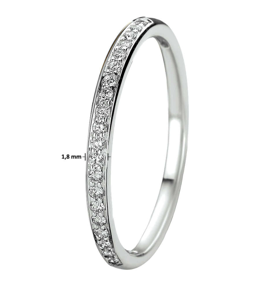 14 Karaat witgouden ring uitgevoerd met schitterende diamant 0.13 crt H/SI. De ring heeft een breedte van 1.8mm. Zeer geschikt om te dragen als aanschuifring.