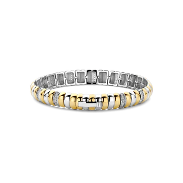 Geniet van sculpturale glans met deze TI SENTO goudkleurig vergulde zilveren armband 23081ZY. Vervaardigd uit 925 sterling zilver, wisselen de gedurfde schakels spiegelend platinakleurig verguld af met stralend goudkleurig verguld, wat een harmonieus ritme rondom de pols creëert. Een centraal pavé-gezette accentsteen voegt verfijnde sprankeling toe en versterkt het contrast tussen warmte en glans. Ontworpen om op zichzelf te schitteren of te combineren in een zorgvuldig samengestelde stack, gaat hij moeiteloos van gestructureerde daglooks naar verfijnde avondoutfits. Nikkelvrij en hypoallergeen, voor luxe comfort in elk detail.