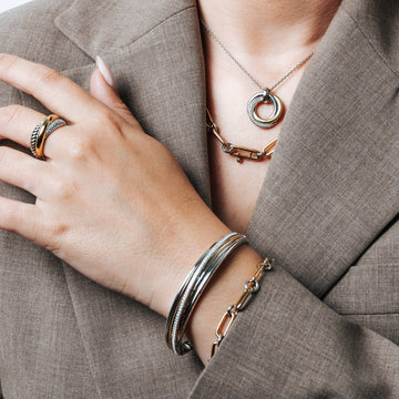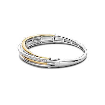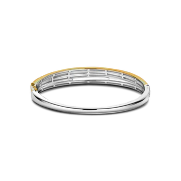 Ervaar de luxe geïnspireerd door vintage met deze TI SENTO vergulde zilveren bangle armband 23046ZY. Gemaakt van 925 sterling zilver en bedekt met platina voor een blijvende schittering, beschikt dit gedurfde statementstuk over drie slanke banden. De centrale band is bedekt met geelgoud, wat een vleugje stralende luxe aan het ontwerp toevoegt. Een vierde band, gedecoreerd met een fonkelende pave van witte cubic zirconia-stenen, kruist de andere banden en creëert een betoverende samensmelting van licht en schaduw. Geïnspireerd door de verfijnde details van architectonische structuren, is deze armband een eerbetoon aan modern design. De gedurfde maar verfijnde esthetiek en de contrasterende texturen van zilver, platina en geelgoud maken dit tot een werkelijk uitzonderlijk stuk. Versterk je dagelijkse look met dit verbluffende accessoire. Draag het alleen voor een gedurfde statement of combineer het met andere TI SENTO armbanden voor een samengestelde ensemble die vintage-geïnspireerde verfijning uitstraalt. Met zorg vervaardigd voor gevoelige huid, garandeert deze nikkelvrije en hypoallergene armband blijvend comfort en kwaliteit.