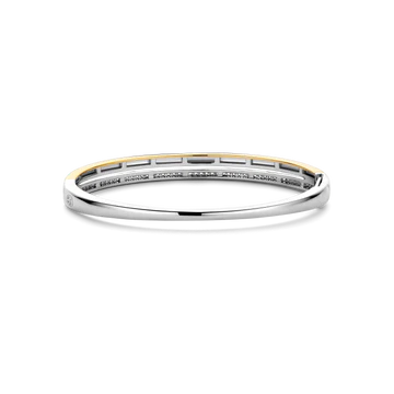 Verfijn je stapel met deze TI SENTO goudkleurig vergulde zilveren bangle 23086ZY. Vervaardigd uit 925 sterling zilver, combineert deze slanke bangle minimalistische vormen met opvallende details: een gladde, goudkleurig vergulde boog vormt de basis, terwijl de bovenkant is afgewerkt in platinakleur en pavé-gezet met een fijne rij briljant geslepen witte cubic zirconia. Het ultra-slanke silhouet glijdt moeiteloos in gelaagde looks, of staat op zichzelf als een subtiel statement van elegantie. Een veilig verborgen sluiting zorgt voor een naadloze pasvorm rond de pols. Nikkelvrij en hypoallergeen, dit sieraad biedt blijvend comfort en een stralende uitstraling, de hele dag door.