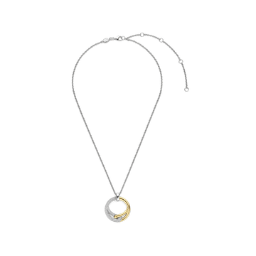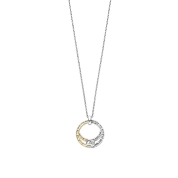 Verhef elke look met dit TI SENTO vergulde collier 34107ZY. Het sierlijke cirkelvormige ontwerp van de hanger is vervaardigd uit hoogwaardig 925 sterling zilver en verrijkt met een stralende goudkleurige vergulding. Drie vloeiende linten – twee pavé gezet met witte zirconia en één gepolijst goudkleurig – verstrengelen zich tot een elegante lus, een symbool van harmonie en oneindige schoonheid. Met een diameter van 24 mm maakt de hanger een verfijnd maar in het oog springend statement, hangend aan een delicaat zilveren collier dat comfortabel langs de halslijn valt. De briljante pavé zetting vangt en weerkaatst het licht vanuit elke hoek en voegt een schitterende glans toe aan zowel casual outfits als gelegenheidslooks. Dit luxe collier combineert klassieke ronde vormen met eigentijdse vloeiende lijnen en maakt het tot een perfect sieraad om cadeau te geven of tot een elegante toevoeging aan je eigen sieradencollectie. Draag het alleen voor een modern statement of combineer het met minimalistische colliers voor een zorgvuldig samengestelde mix. Nikkelvrij en hypoallergeen, ontworpen voor draagcomfort de hele dag en blijvende schoonheid.