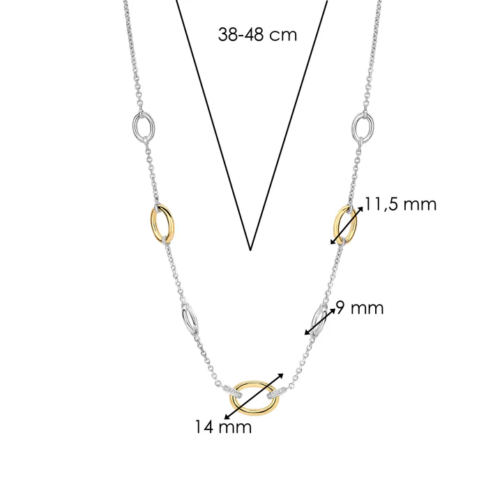 De TI SENTO ketting 34093ZY combineert moderne luxe met tijdloze charme. Gemaakt van hoogwaardig 925 sterling zilver, straalt dit statement sieraad met warme vergulding en stralende platinakleurige accenten, wat zorgt voor een opvallend contrast. In het midden is een gedurfde, goudkleurige ovaal versierd met pavé gezette cubic zirconia, zorgvuldig geplaatst om het licht bij elke beweging te vangen en te weerkaatsen. Ontworpen om elke look een verfijnde edge te geven, is deze ketting net zo veelzijdig als betoverend. Of je de ketting nu solo draagt voor een subtiel statement of in laagjes met delicate kettingen voor een eigentijdse twist, de ketting straalt moeiteloze elegantie uit. Nikkelvrij en hypoallergeen, biedt hij comfort zonder in te boeten aan verfijning—een essentieel stuk dat een vleugje schittering aan elk moment toevoegt.