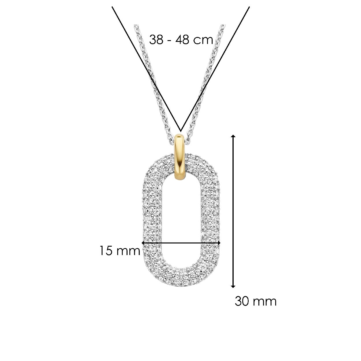 Deze TI SENTO vergulde zilveren ketting 3964ZY heeft een ovaalvormige bedel met een pavé van glinsterende witte cubic zirconia. Een vergulde clipsluiting verbindt de bedel met de zilveren ketting. Deze ketting, gemaakt van 925 sterling zilver, is een luxe statement piece. Creëer laagjes door het te combineren met wat kortere en stevigere kettingen of zet haar in de spotlights en draag het solo. De lengte van deze ketting is verstelbaar, tussen 38 en 48 cm.