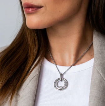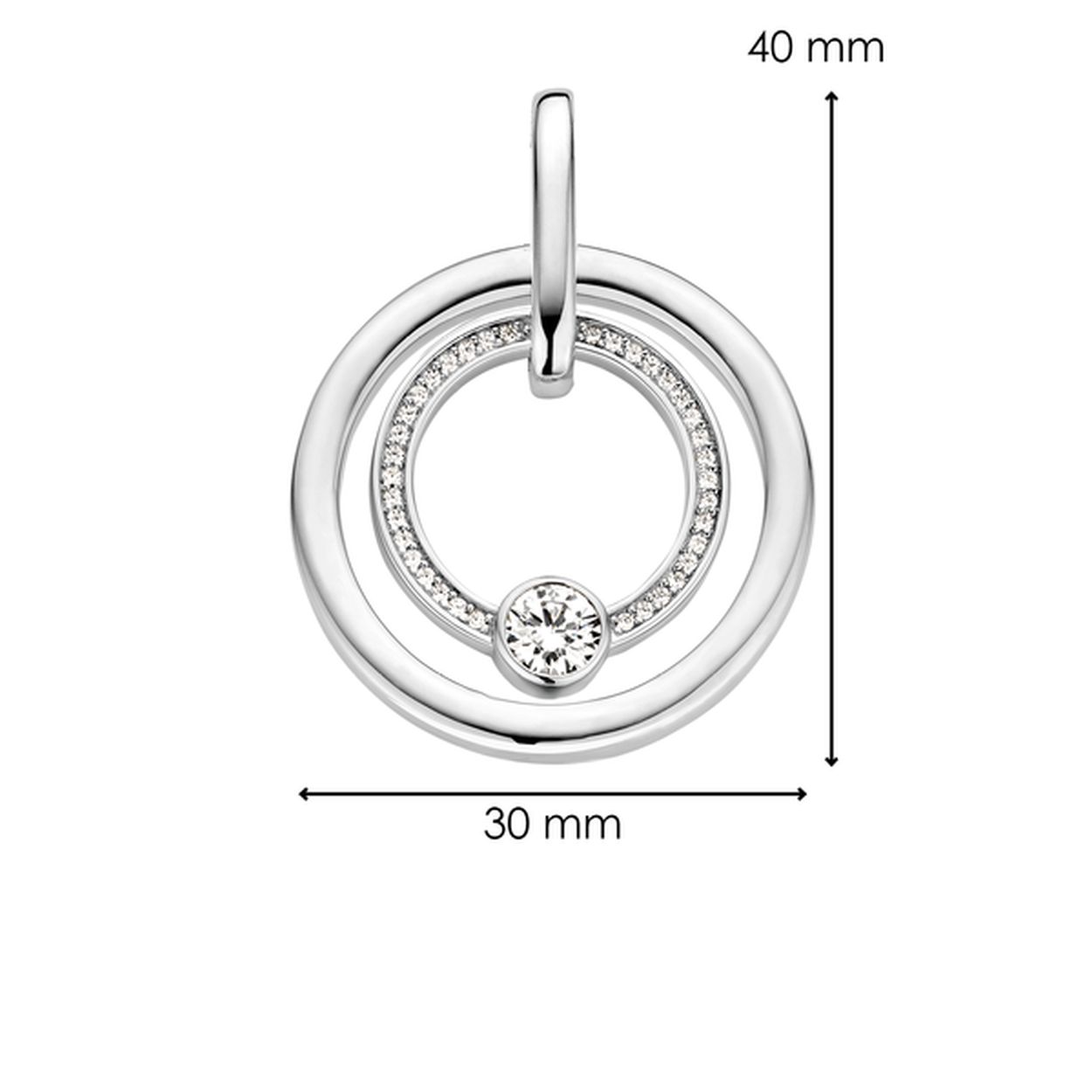 Een unieke TI SENTO hanger die door de openheid tergelijkertijd verfijnd is als ook volumieus. Twee cirkels die los van elkaar bewegen vormen het design van de hanger. De buitenste cirkel is gemaakt van glad gepolijst zilver en omarmt de binnenste cirkel welke pavé gezet is met zirconia's. De binnenste ring heeft in het midden een grotere zirconia welke door de bezel zetting een mooi geheel vormt met het strakke design.