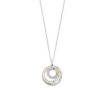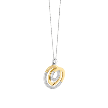 Laat je omringen door sculpturale schittering met deze TI SENTO vergulde hanger 6851ZY. Vervaardigd uit 925 sterling zilver bestaat deze hanger uit twee in elkaar grijpende cirkels: één hoogglanzend goudkleurig verguld, de ander platinakleurig verguld en pavé gezet met briljant geslepen witte zirconia. Het overlappende ontwerp creëert een verfijnde spiraal van licht en contrast, een symbool van eenheid en beweging. Een slanke platinakleurig vergulde hanger bevestigt het sieraad aan je favoriete collier, perfect om diepte toe te voegen aan een gelaagde look of solo gedragen als betekenisvol accent. Nikkelvrij en hypoallergeen, hij biedt blijvende glans met vederlicht draagcomfort. De hanger wordt geleverd met een verfijnd zilver collier.