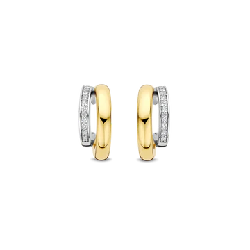 Omarm sculpturaal contrast met deze TI SENTO goudkleurig vergulde zilveren oorbellen 78035ZY. Vervaardigd uit 925 sterling zilver, vormt elke oorbel een gedurfde, asymmetrische ring bestaande uit twee in elkaar grijpende bogen: één strak en goudkleurig verguld, de ander platinakleurig verguld en pavé-gezet met briljant geslepen witte cubic zirconia. De vloeiende compositie creëert een subtiel samenspel van licht, kleur en textuur—perfect om zowel minimalistische outfits als avondlooks te verrijken. Compact maar opvallend, bieden ze een verfijnde twist aan klassieke hoops. Nikkelvrij en hypoallergeen, ze garanderen moeiteloze elegantie en draagcomfort voor de gevoelige oren gedurende de hele dag.