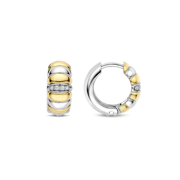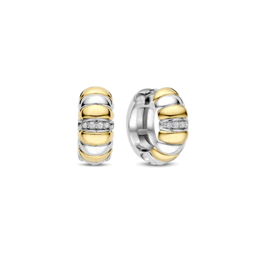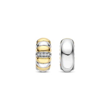 Geniet van sculpturale elegantie met deze TI SENTO goudkleurig vergulde zilveren oorbellen 78024ZY. Vervaardigd uit 925 sterling zilver, heeft elke oorbel een ritmische reeks van goudkleurig vergulde en platinakleurig vergulde schakels, geaccentueerd door een centrale band van pavé-gezette witte cubic zirconia. Hun verfijnde geometrie speelt met licht en textuur en weerspiegelt de vloeiende beweging van architectonische vormen. Gedurfd maar draagbaar, ze tillen zowel strakke tailoring als vloeiende zijde naar een ingetogen luxueus niveau. Combineer ze met de bijpassende armband of ring voor een samenhangende, high-impact look. Nikkelvrij en hypoallergeen, voor luxe comfort van dag tot nacht.