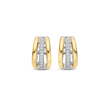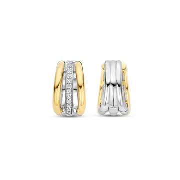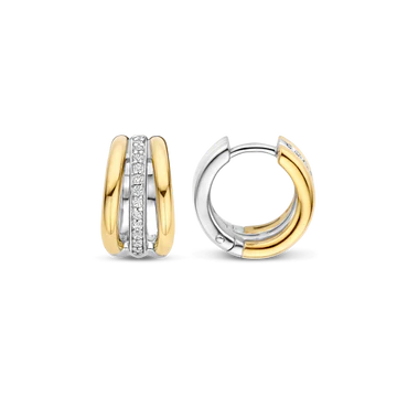 Deze TI SENTO oorbellen 78010ZY combineren diepte, contrast en schittering. Gemaakt van 925 sterling zilver, hebben ze een driedubbel hoepelontwerp: twee goudkleurige banden omarmen een platinakleurige hoepel met pavé gezette cubic zirconia. Deze oorbellen voegen een elegante touch toe aan elke outfit. De veilige scharnier sluiting zorgt voor comfort, waardoor ze de hele dag gedragen kunnen worden. Nikkelvrij en hypoallergeen voor luxueus comfort. Een mix van gouden warmte, ijzige schittering en eigentijds design, perfect voor elke gelegenheid.