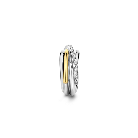 Deze vergulde TI SENTO ring 12318ZY is een fascinerende mix van verfijning en glamour. Het toont fijne verstrengelde ringen met een harmonieuze mix van premium zilver, stralend geelgoud en oogverblindende kubieke zirkonia. De ring is gemaakt van eersteklas 925 sterling zilver en platina om hem te beschermen tegen dagelijks gebruik en om het stralend te houden. Het verstrengelde ontwerp symboliseert balans en maakt het een perfect statement voor zowel overdag als 's avonds. Draag deze ring om een gedurfd statement te maken of combineer hem met andere ringen voor een verzorgde en gepersonaliseerde look. Net als al onze sieraden is deze ring nikkelvrij en hypoallergeen, zodat je niet alleen verzekerd bent van stijl, maar ook van comfort en kwaliteit.