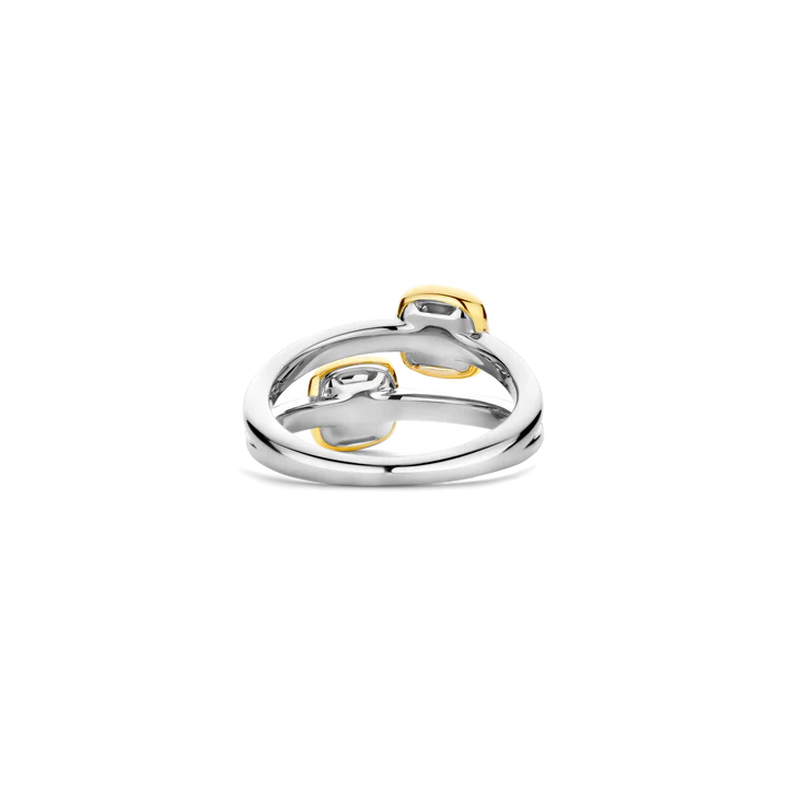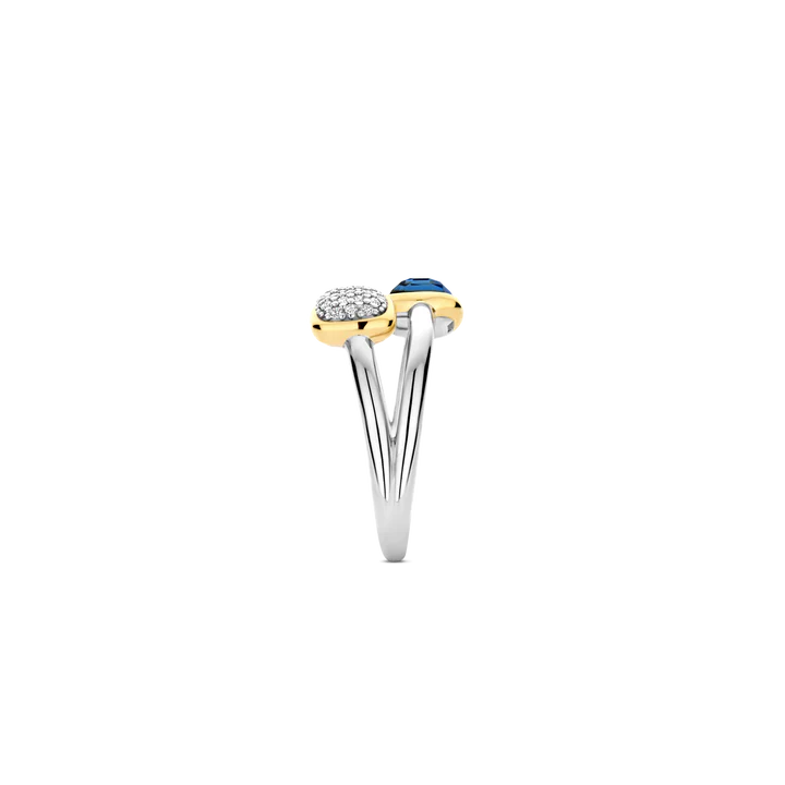 Ontdek de opvallende schoonheid van contrast met de TI SENTO ring 12352DB. Dit unieke ontwerp bestaat uit twee afzonderlijke ringen die elegant samenkomen met een ruimte ertussen. Elke ring toont een cushion-geslepen steen: de ene is versierd met een betoverende donkerblauwe steen, terwijl de andere schittert met een pavé van stralende witte cubic zirconia. Beide stenen zijn gezet in een stralend vergulde zettingen, wat hun natuurlijke schoonheid versterkt. De schachten van beide ringen zijn vervaardigd van platina-geplateerd zilver, wat zorgt voor duurzaamheid en extra glans, terwijl de open ruimte tussen de ringen een moderne en dynamische touch aan het ontwerp toevoegt. Deze ring kan zowel op zichzelf gedragen worden voor een subtiele elegantie als gecombineerd met andere TI SENTO sieraden voor een unieke, persoonlijke stijl. Hij past perfect bij elke gelegenheid, van informele uitstapjes tot formele avondbijeenkomsten. Zorgvuldig vervaardigd voor de gevoelige huid, deze nikkelvrije en hypoallergene ring zorgt voor blijvend comfort en kwaliteit.