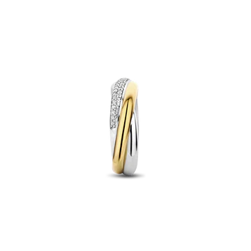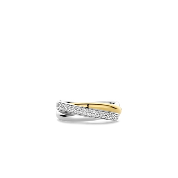 Ervaar hedendaagse elegantie met de TI SENTO gouden ring 12343ZY. Dit betoverende sieraad heeft twee vloeiende ringen die elkaar elegant kruisen, wat zorgt voor een dynamisch en opvallend ontwerp. De ene ring is bezet met schitterend pavé van witte zirconia-stenen en de andere ring is verguld met een stralende goudkleur. Het contrast tussen het romantische pavé en warm, rijke goudkleur geeft een betoverende uitstraling aan je handen. Gemaakt van 925 sterling zilver en verzilverd voor langdurige schittering, is deze ring een voorbeeld van moderne luxe. De vloeiende lijnen en harmonieuze mix van materialen maken het een werkelijk uitzonderlijk sieraad. Versterk je dagelijkse look met deze verfijnde accessoire. Met zorg vervaardigd voor gevoelige huid, zorgt deze nikkelvrije en hypoallergene ring voor langdurig comfort en kwaliteit.
