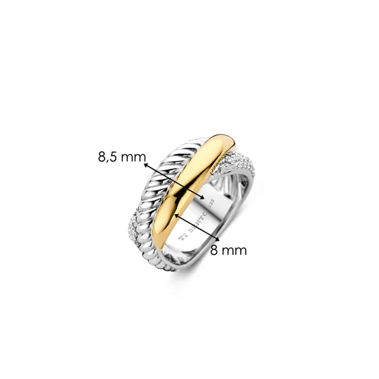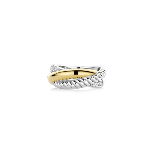 Laat je verleiden door de betoverende combinatie van texturen en metalen met deze TI SENTO vergulde zilveren ring 1973ZY. Dit gedurfde sieraad heeft drie met elkaar verweven ringen: één is verguld met glanzend geel goud, wat een warm contrast creëert met het koele zilver van de andere twee ringen. Een andere ring heeft een gedraaid ontwerp, wat een vleugje dynamiek toevoegt, en de derde ring is versierd met een fonkelende pavé van witte cubic zirconia stenen, wat een vleugje weelderige schittering aan het stuk toevoegt. Gemaakt van 925 sterling zilver en verguld met platina voor blijvende schittering, is deze ring een bewijs van moderne luxe. Het complexe ontwerp en de opvallende combinatie van materialen maken het een echt statement stuk. Voeg wat flair toe aan je dagelijkse look met dit gedurfde accessoire. Vakkundig vervaardigd voor gevoelige huiden, zorgt deze nikkelvrije en hypoallergene ring voor blijvend comfort en kwaliteit.