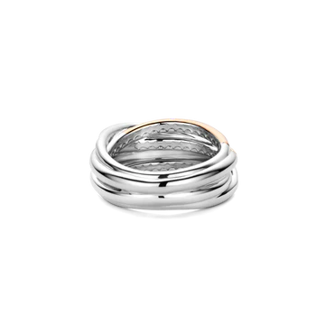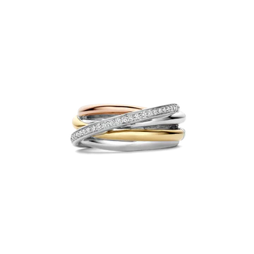 Omarm moderne harmonie met deze TI SENTO driekleurige ring 12318ZT. In elkaar gevlochten banden vormen een kunstzinnig ritme van stralend geelverguld, zacht roséverguld, zilver en een schitterend pavé van cubic zirconia, allemaal vervaardigd uit 925 sterling zilver. Een rij briljant geslepen witte cubic zirconia siert één van de banden en geeft extra licht en diepte zonder het ontwerp te overheersen. Draag deze ring solo als opvallend statement of combineer hem met verfijnde stapelringen voor een persoonlijke look. Met zorg vervaardigd voor de gevoelige huid, is deze nikkelvrije en hypoallergene ring ontworpen voor blijvend comfort en kwaliteit.