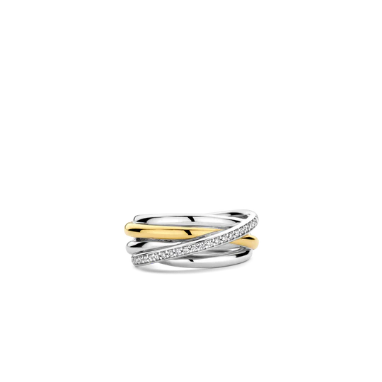 Deze vergulde TI SENTO ring 12318ZY is een fascinerende mix van verfijning en glamour. Het toont fijne verstrengelde ringen met een harmonieuze mix van premium zilver, stralend geelgoud en oogverblindende kubieke zirkonia. De ring is gemaakt van eersteklas 925 sterling zilver en platina om hem te beschermen tegen dagelijks gebruik en om het stralend te houden. Het verstrengelde ontwerp symboliseert balans en maakt het een perfect statement voor zowel overdag als 's avonds. Draag deze ring om een gedurfd statement te maken of combineer hem met andere ringen voor een verzorgde en gepersonaliseerde look. Net als al onze sieraden is deze ring nikkelvrij en hypoallergeen, zodat je niet alleen verzekerd bent van stijl, maar ook van comfort en kwaliteit.