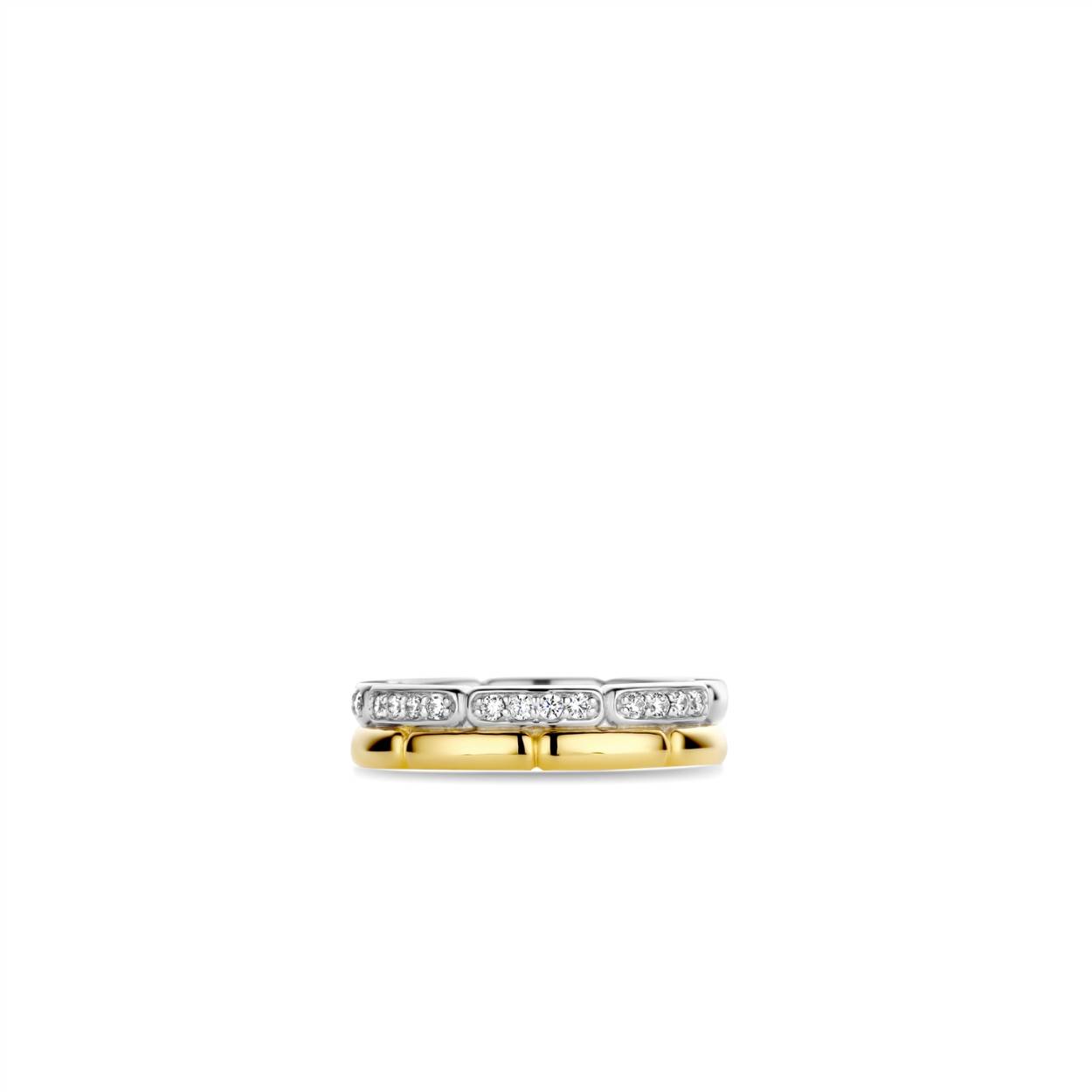 Deze TI SENTO vergulde zilveren ring 12271ZY bestaat uit twee reeksen van rechthoekjes. Een van de reeksen is gedecoreerd met een handgezet pavé van witte cubic zirconia steentjes en de ander plated met goud. De ring is gemaakt van 925 sterling zilver. Draag haar gouden gloed overal bij je.
