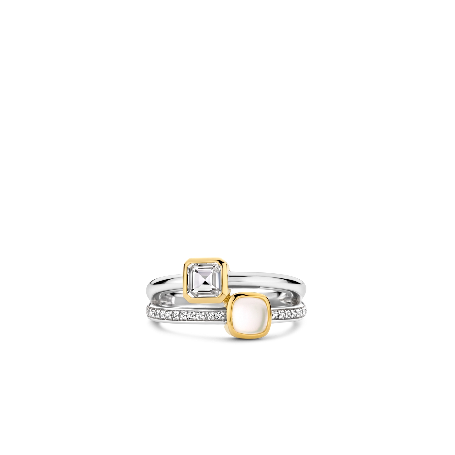 Deze vergulde TI SENTO ring 12326MW is een fascinerende mix van verfijning en veelzijdigheid. De ring heeft twee ringen: één met een glanzende vierkante parelmoersteen, delicaat gezet in een stralende geelvergulde zetting. De schacht pronkt met een briljant patroon van kubieke zirkonia, wat een extra laag glamour toevoegt. De tweede ring heeft een vierkante zirkonia, gezet in een vergulde zetting en met een gladde schacht die moderne elegantie uitstraalt. De ring is gemaakt van eersteklas 925 sterling zilver en verguld met stralend geelgoud. Alleen gedragen of gestapeld met andere ringen, met dit duo kun je je eigen unieke look samenstellen. Verrijk je stijl met deze speelse ring, waarbij de samensmelting van parelmoer, zirkonia en vergulde accenten zorgt voor een dynamisch en persoonlijk statement.