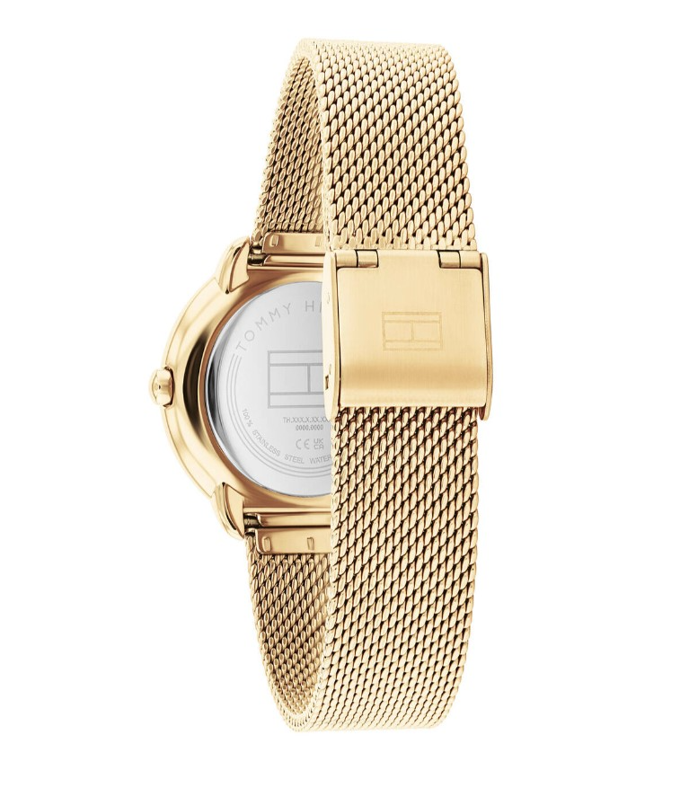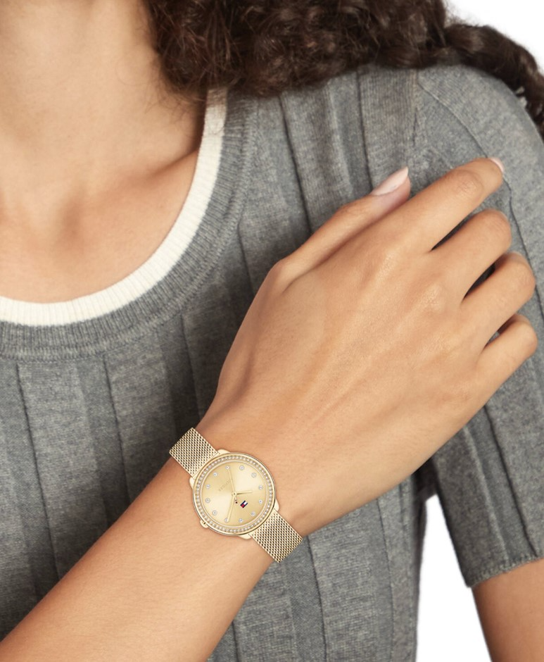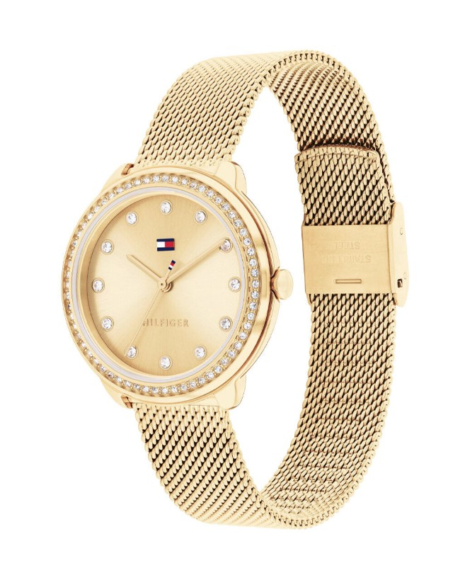 Tommy Hilfiger dames pols horloge model TH1782586. Serie Demi. Stalen kast en band goudkleurig. 3 ATM waterdicht.