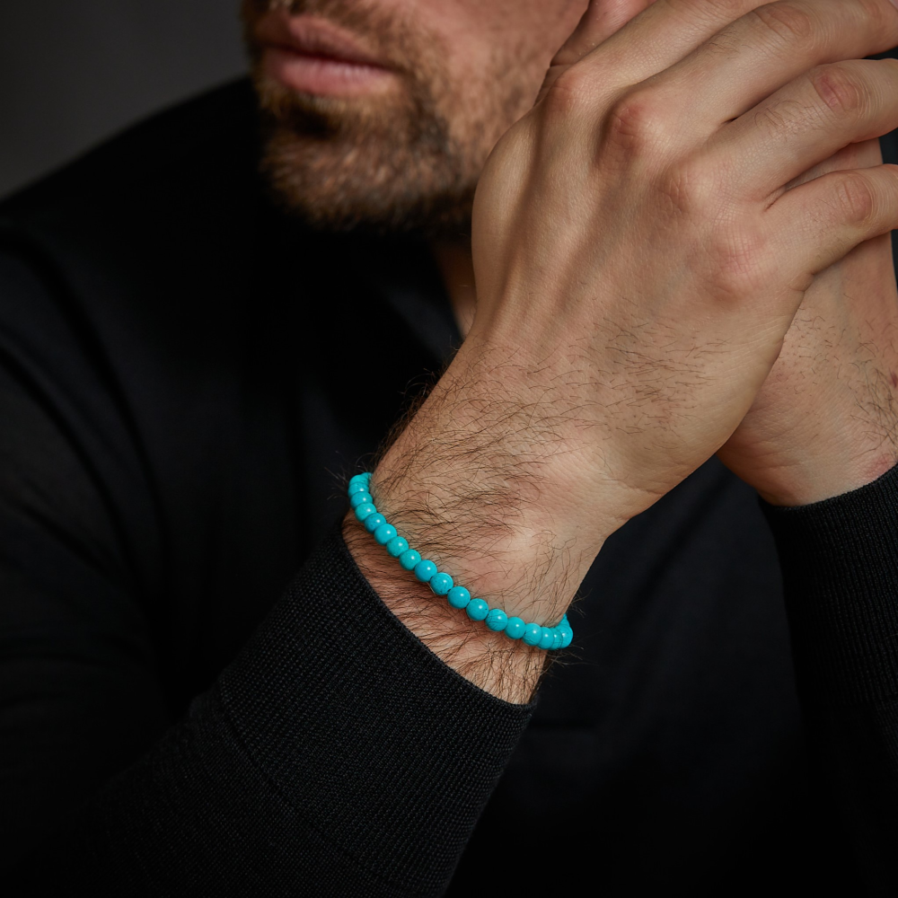 Edelstenen bead armband, handgemaakt van 6mm Turquoise met een zilverkleurige sluiting. Het Rebel & Rose sieraad is makkelijk te combineren met andere zilveren, leren of kralenarmbanden.