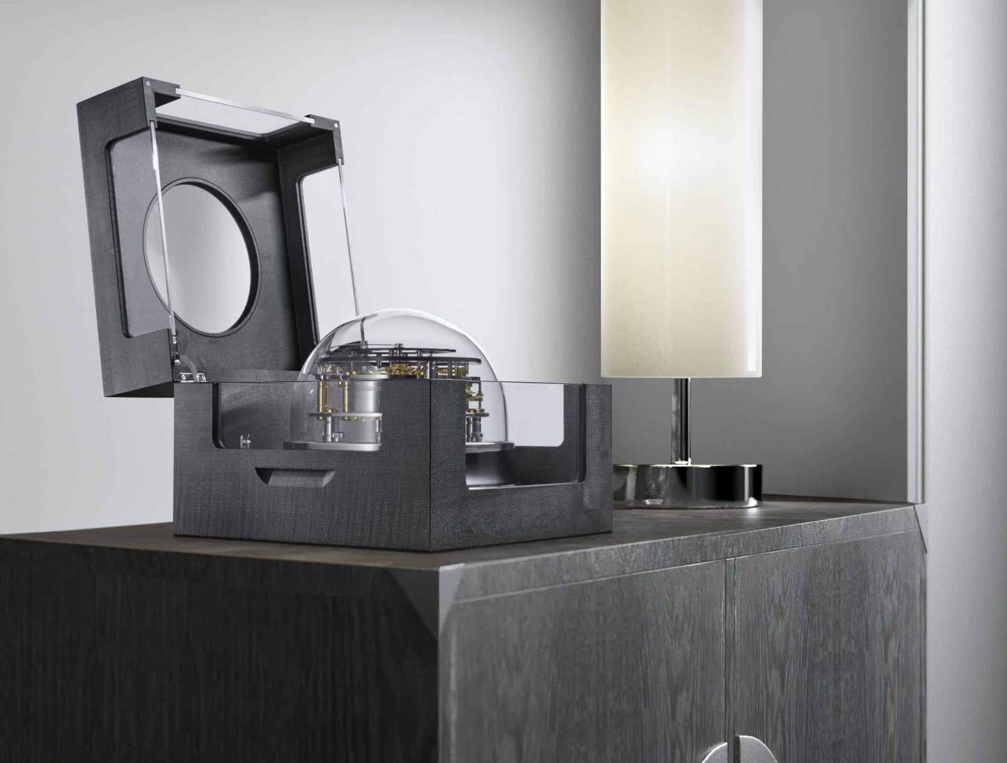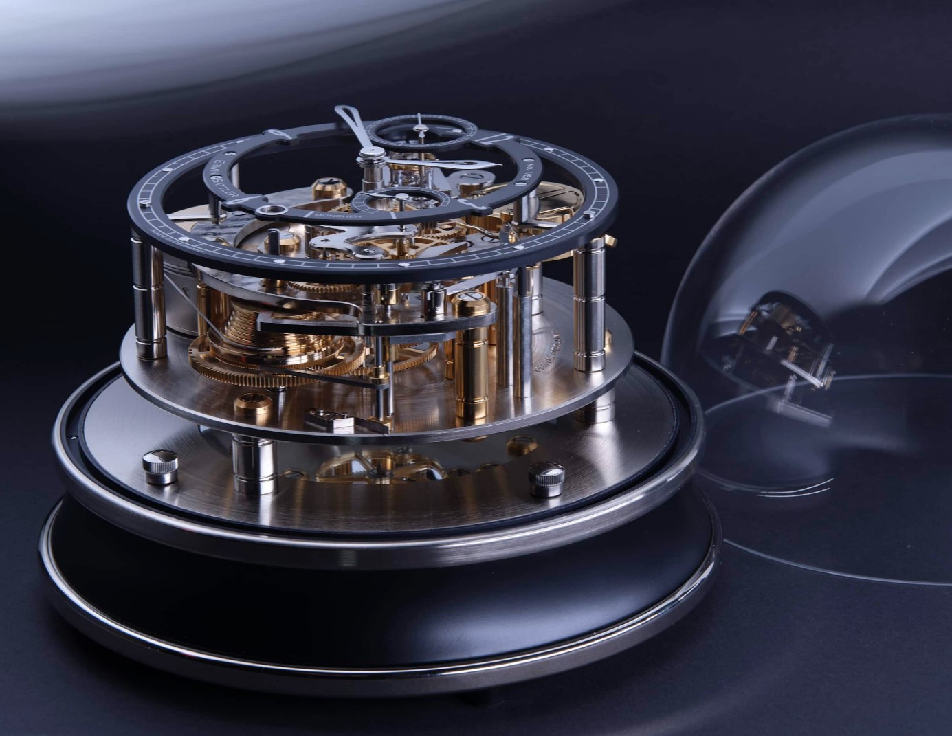 De mond geblazen glazen koepel, die het fraai en exclusieve uurwerk beschermt, geeft de klok niet alleen zijn naam, maar zorgt er ook voor dat het uurwerk van bijna alle kanten zichtbaar is. Het uurwerk en de minimalistische, zwart geanodiseerde wijzerplaatringen, inclusief de gewelfde wijzers, zweven bijna gewichtloos in de ruimte. Deze nieuwe 2025 introductie is gelimiteerd op 58 stuks.