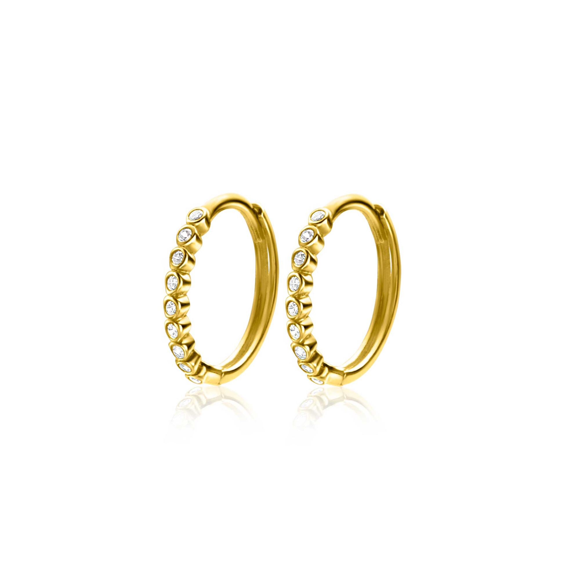ZINZI Gold 14 karaat gouden oorringen 12mm bezet met witte zirconia's in ronde zettingen. Met luxe scharniersluiting. Grootte 12mm met een 1,5mm brede buis. Vervaardigd van geheel 14 karaat goud (585).