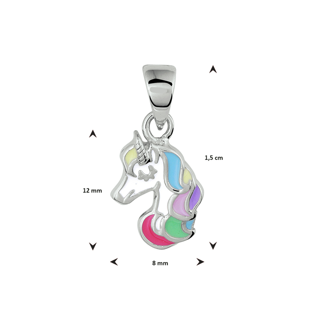 Gerhodineerd 925 zilveren hanger in de vorm van een eenhoorn, uitgevoerd met gekleurd emaille. De hanger heeft een totale hoogte van 1.5cm en een breedte van 8mm.