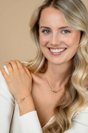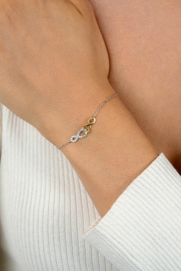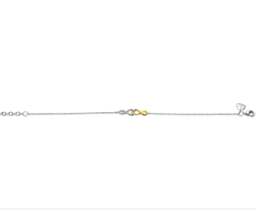 ZINZI zilveren fantasie armband met aan elkaar verbonden Infinity tekens, waarbij het ene teken bezet is met witte zirkonia's en het andere teken in gold plated afgewerkt is. De lengte van de armband is te variëren tussen 17cm en 19cm. Vervaardigd van eerste gehalte zilver (925) en voorzien van een extra rodiumlaag voor een langdurige glans. En extra geel verguld.