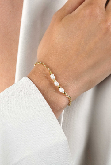 ZINZI gold plated zilveren schakelarmband met drie ovale witte zoetwaterparels in het midden. De parels zijn natuurlijk gevormd en nooit perfect ovaal. De lengte van de armband is te variëren tussen 17cm en 19cm. Vervaardigd van eerste gehalte zilver (925) en extra geel verguld.
