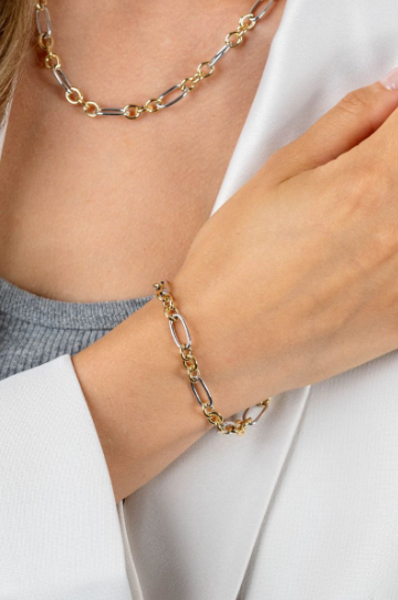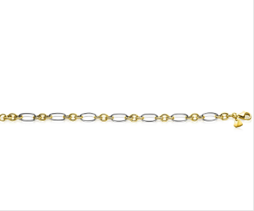 ZINZI bicolor schakelarmband met gold plated zilveren jasseron schakels en zilveren ovale schakels 7mm breed. Combineer de armband met de bijpassende ketting en maak gemakkelijk een chique look. De lengte van de armband is 19,5cm. De armband is vervaardigd van eerste gehalte zilver (925) en extra geel verguld.