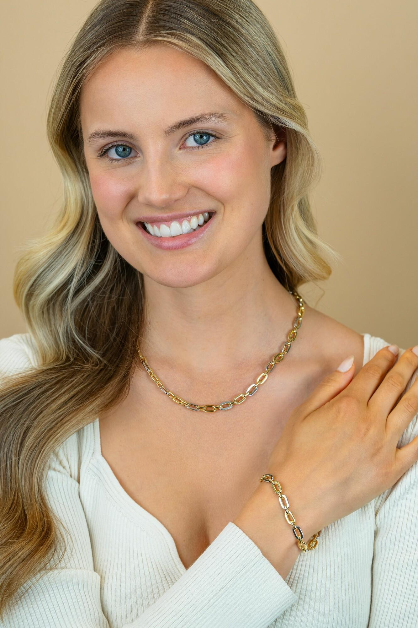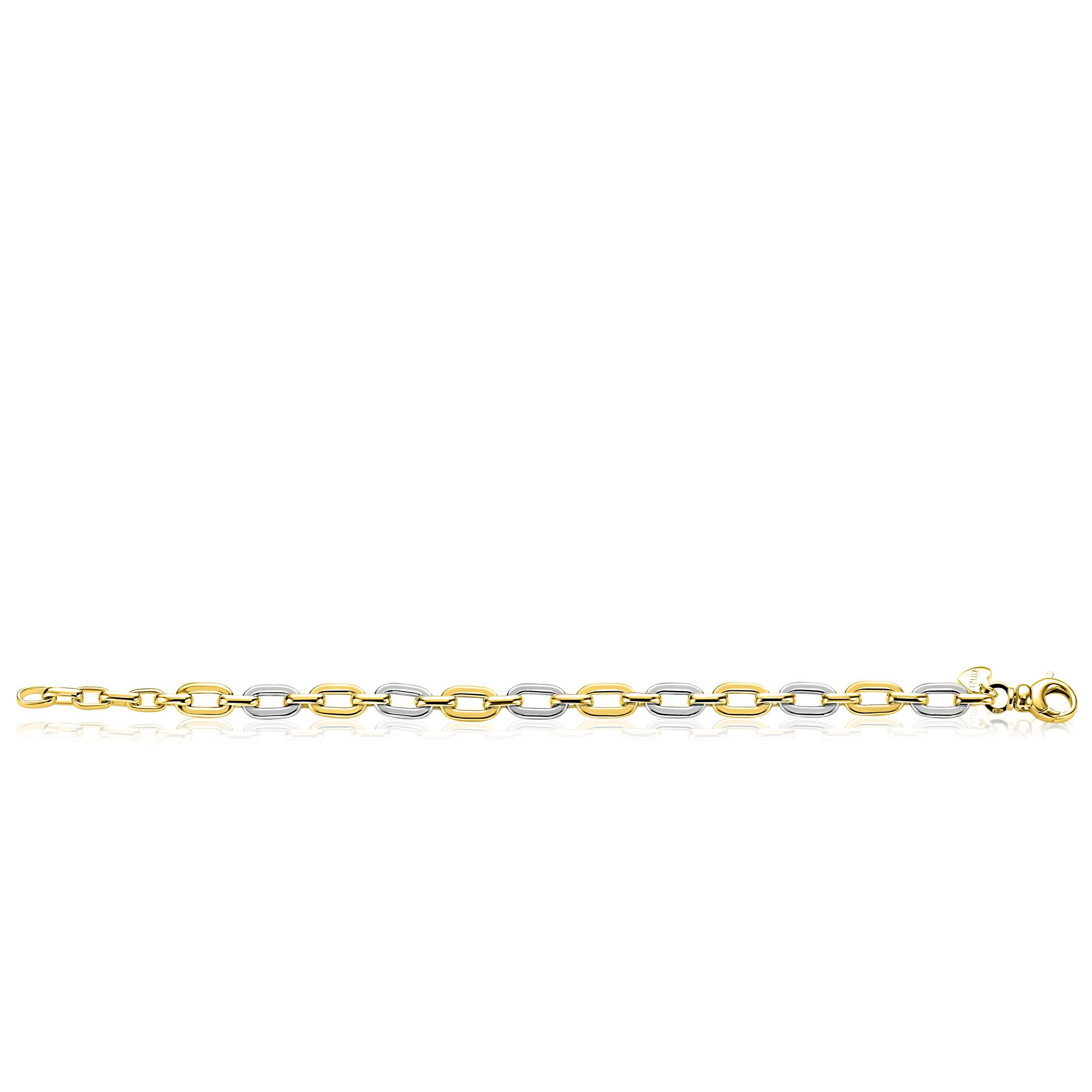 ZINZI gold plated zilveren schakelarmband met bicolor rechthoekige schakels (6,5mm breed). De armband heeft een stevige karabijnsluiting. Een tijdloos sieraad dat zowel casual als chique draagbaar is. Vervaardigd van eerste gehalte zilver (925) en voorzien van een extra rodiumlaag voor een langdurige glans.