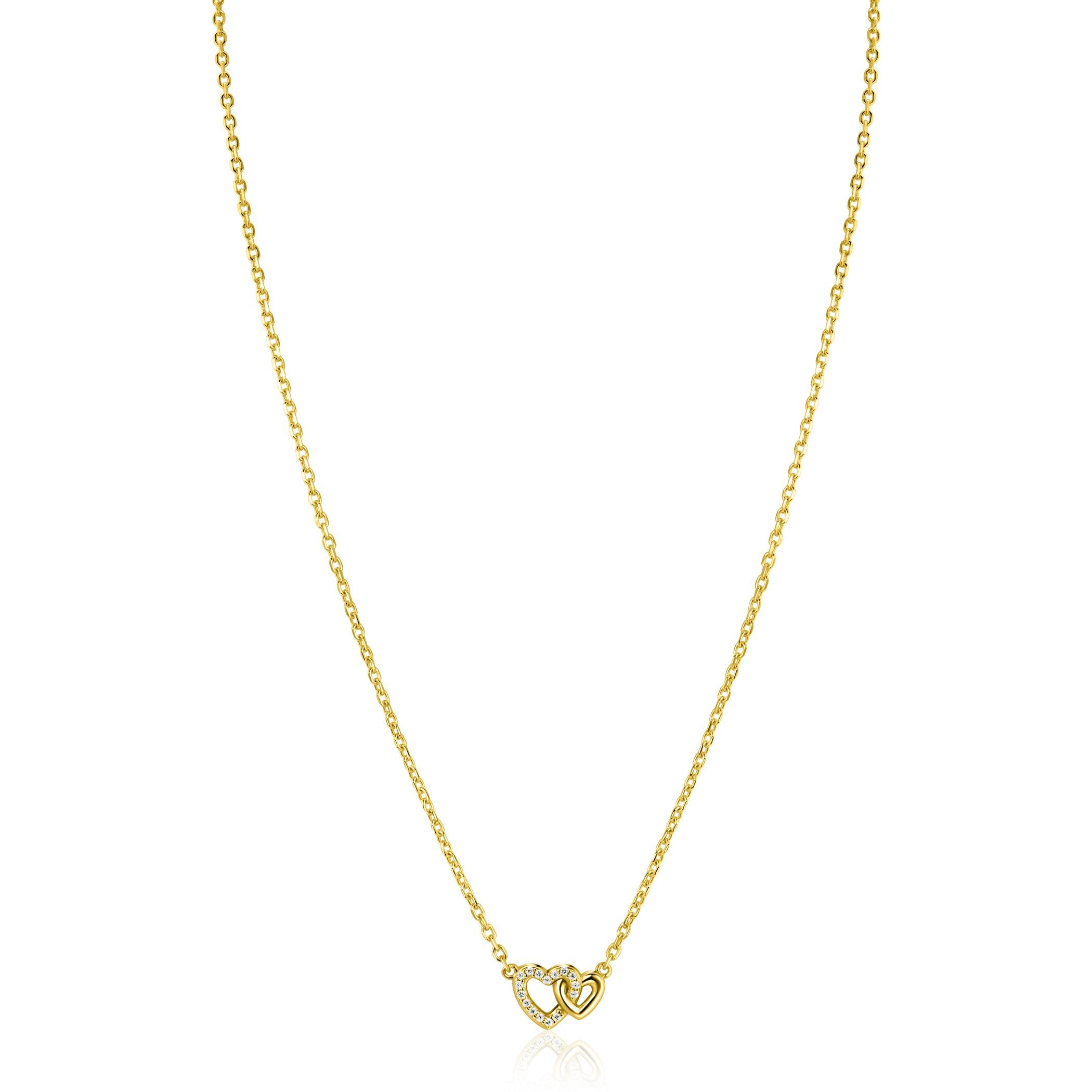ZINZI gold plated zilveren ketting (42-45cm) met twee verbonden hartjes, waarvan één schitterend bezet is met witte zirkonia's. De lengte is verstelbaar tussen 42cm en 45cm. Vervaardigd van eerste gehalte zilver (925) en extra geel verguld.
