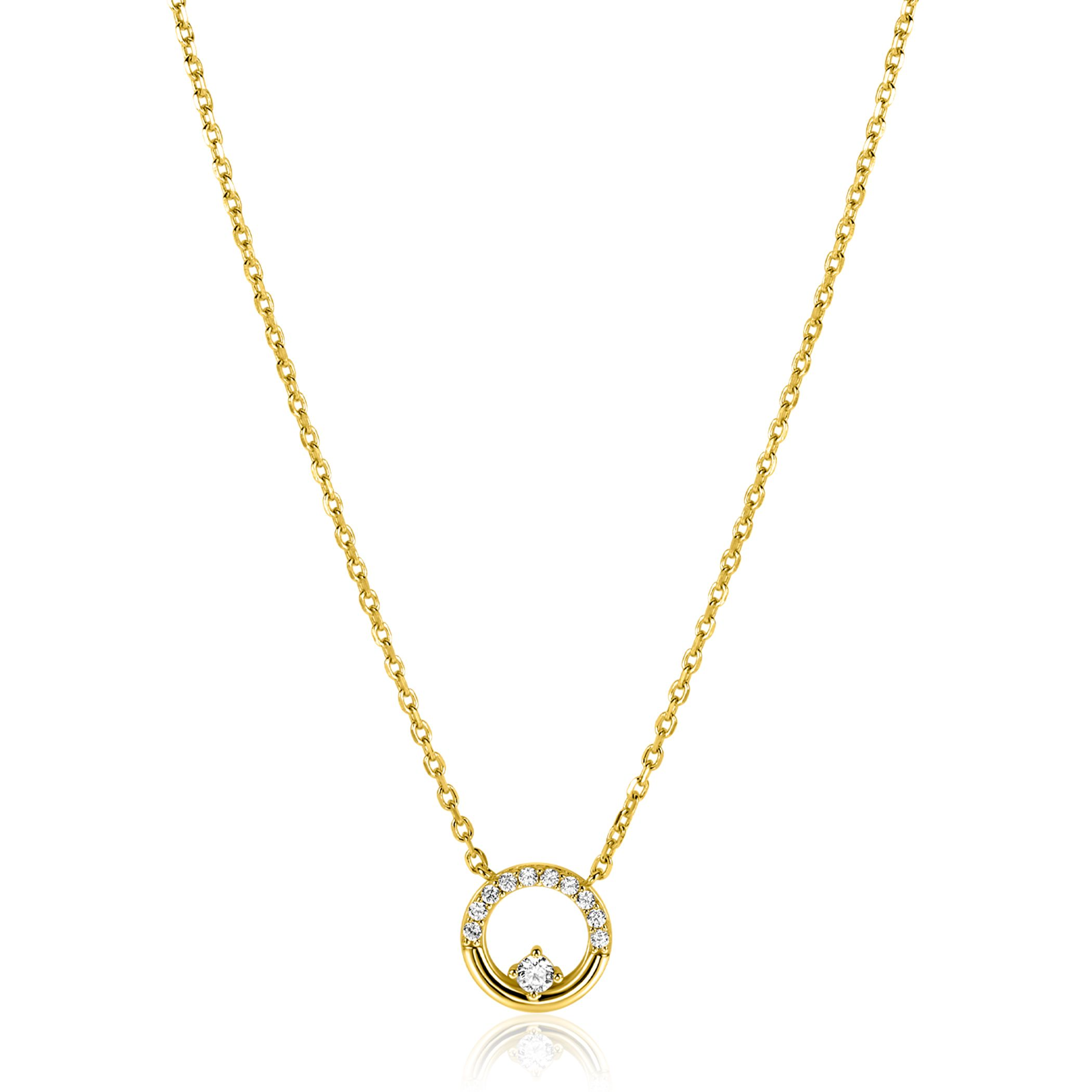ZINZI gold plated zilveren ketting met ronde open hanger (12mm), afwisselend creatief bezet met witte zirkonia's. De lengte is te variëren tussen 42 en 45cm. De ketting is vervaardigd van eerste gehalte zilver (925) en extra geel verguld.