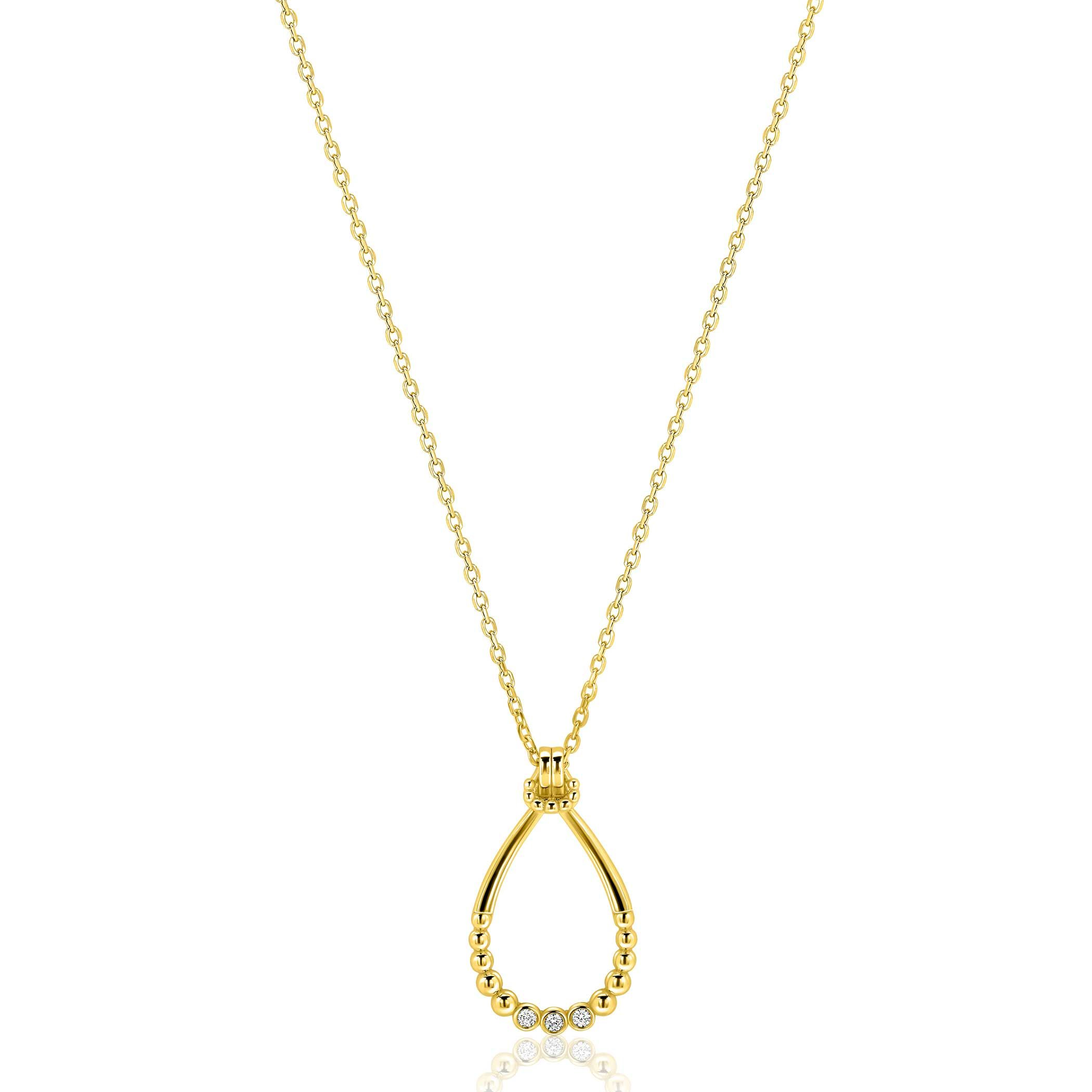 ZINZI goldplated zilveren ketting 45cm met open druppelvormige hanger (31mm), speels bezet met bolletjes en drie witte zirkonia’s. De lengte van de ketting is verstelbaar van 42cm tot 45cm. Vervaardigd van eerste gehalte zilver (925) en extra geel verguld.