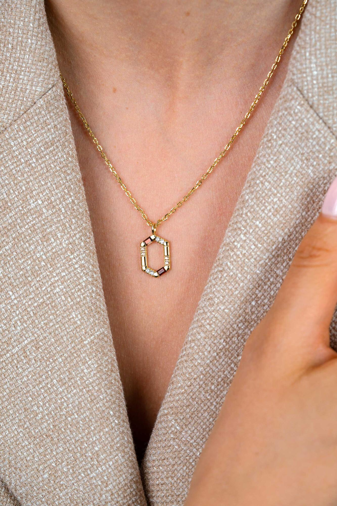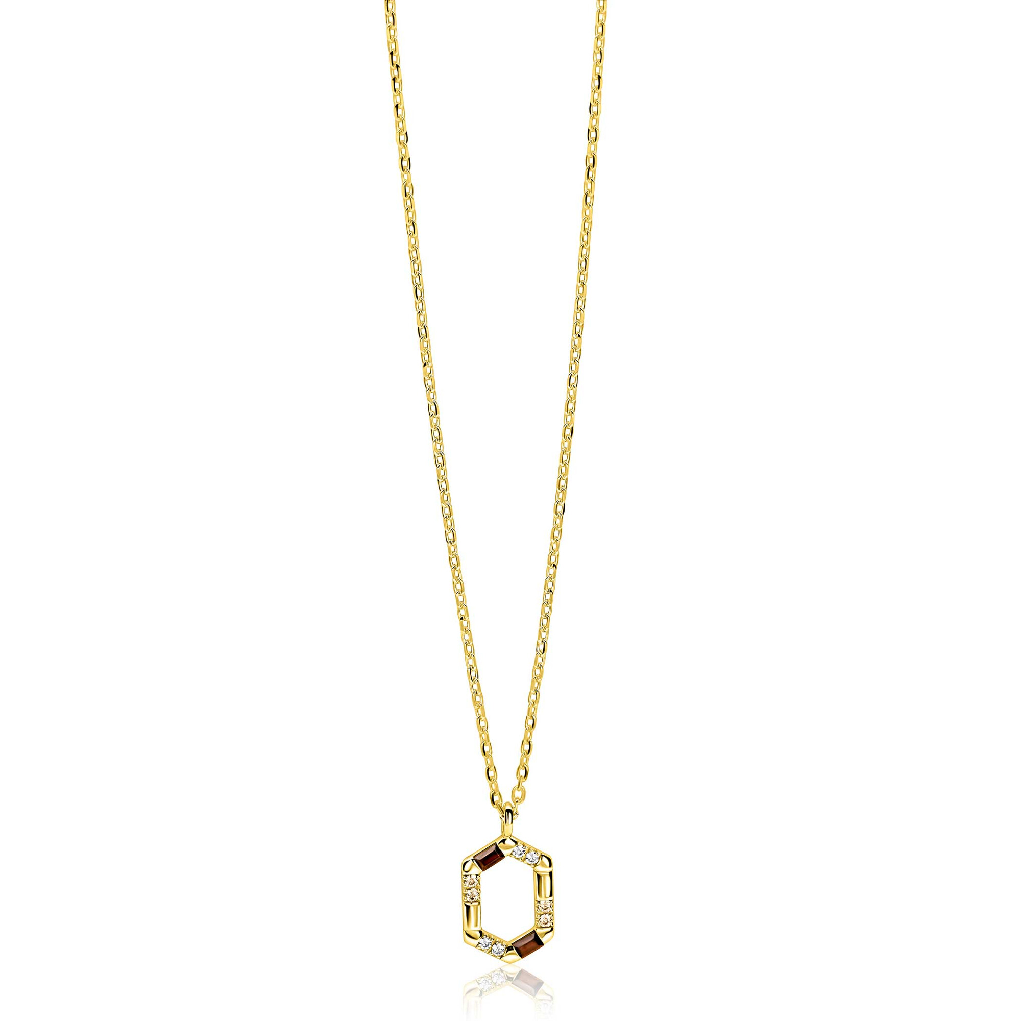 ZINZI gold plated zilveren ketting met zeshoekige hanger (18mm) bezet met champagne, bruine en witte kleurstenen. De lengte van de ketting is te variëren tussen 42 en 45cm. De combinatie van ronde en rechthoekige kleurstenen en de moderne zeshoeksvorm geven de hanger een bijzondere uitstraling. De ketting is vervaardigd van eerste gehalte zilver (925) en extra geel verguld.