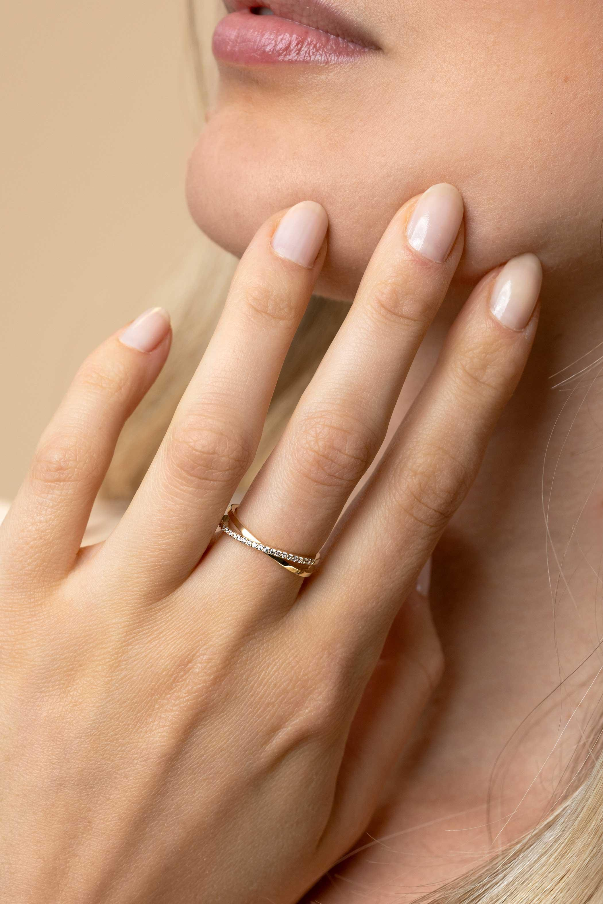ZINZI Gold 14 krt gouden ring met cross-over design waarbij een gladde band en een band bezet met witte zirconia's elkaar kruisen. Vervaardigd van geheel 14 karaat goud (585).