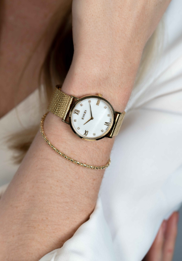 Het ZINZI Roman horloge is een sierlijke eyecatcher. Met zijn geelgoudkleurige stalen kast van 34mm oogt dit horloge trendy op de dunnere pols. En de sierlijke romeinse cijfers geven de wijzerplaat een tijdloos karakter. Voorzien van een witte parelmoer wijzerplaat, die is bezet met witte zirconia's op de uur-aanduiding. Het extra dunne Japanse uurwerk met datum en de platte ronde stalen kast (34mm) zorgen voor een elegante maar fashionable look. Met trendy stalen meshband van 18mm breed.