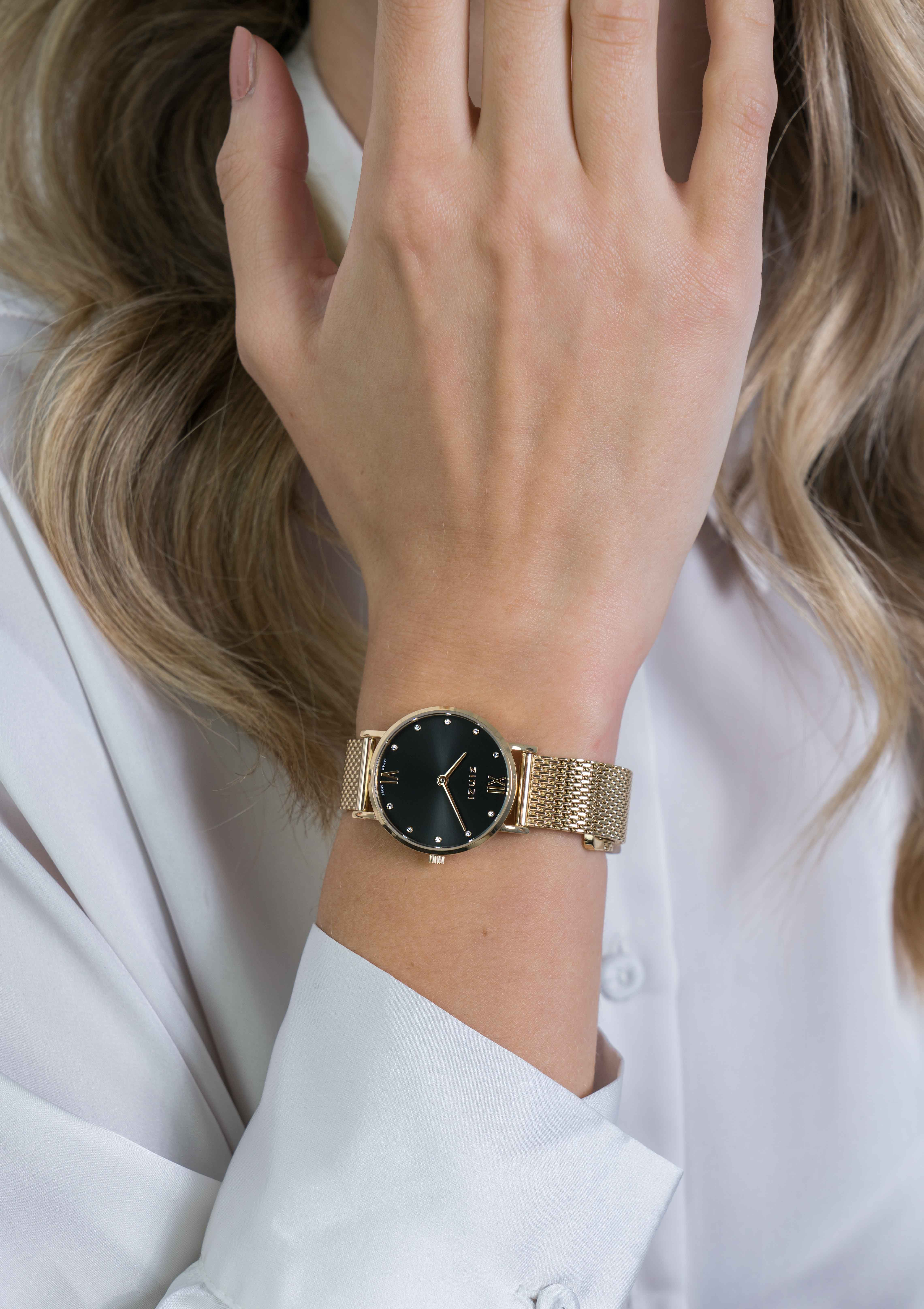 Het ZINZI Lady Crystal horloge is het kleinste model van de ZINZI horloges. Met zijn geheel geelgoudkleurige stalen kast van 28mm oogt dit horloge elegant op iedere pols. De zwarte wijzerplaat is bezet met schitterende witte crystals bij de uuraanduiding. De platte ronde stalen geelgoudkleurige kast (28mm) en de romeinse cijfers zorgen voor een classic en elegante look. Voorzien van een geelgoudkleurige stalen mesh band (14mm). De stalen meshband is eenvoudig te verwisselen door het handige schuifsysteem aan de achterkant. 5atm waterbestendig (tegen regen en spatwater) en met sterk mineraal glas.