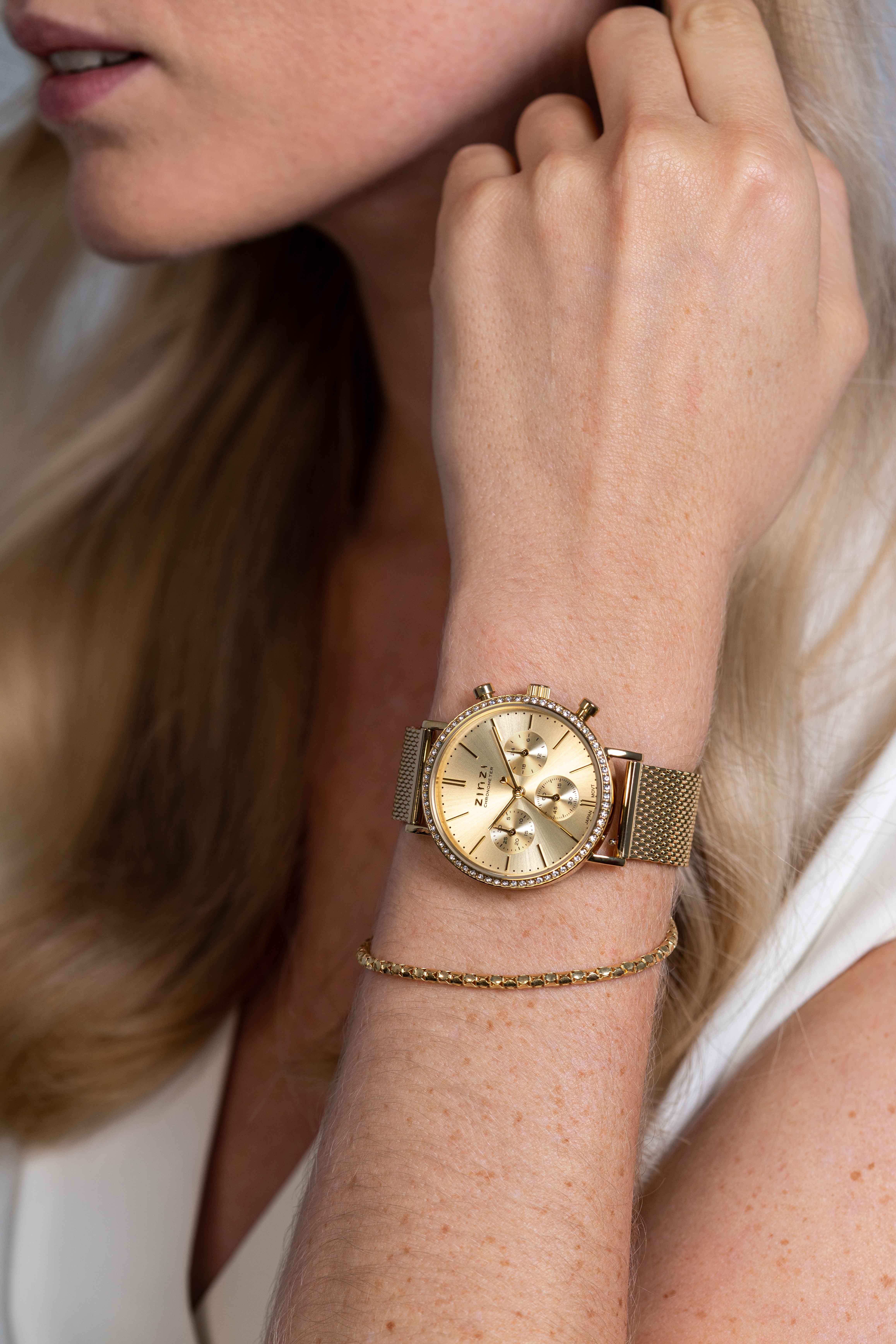 Dit Zinzi Chronometer horloge (36mm) is een sportieve eyecatcher. De rand van de geelgoudkleurige ronde kast is bezet met witte crystals en op de goudkleurige 'sunray' wijzerplaat sieren 3 chronograph meters . De stopwatch is makkelijk te bedienen en geeft het horloge een stoere uitstraling. Deze 'Chrono Grace' is voorzien van een trendy stalen mesh band in de kleur goud. Ook 5atm waterbestendig (tegen regen en spatwater) en met sterk mineraal glas.