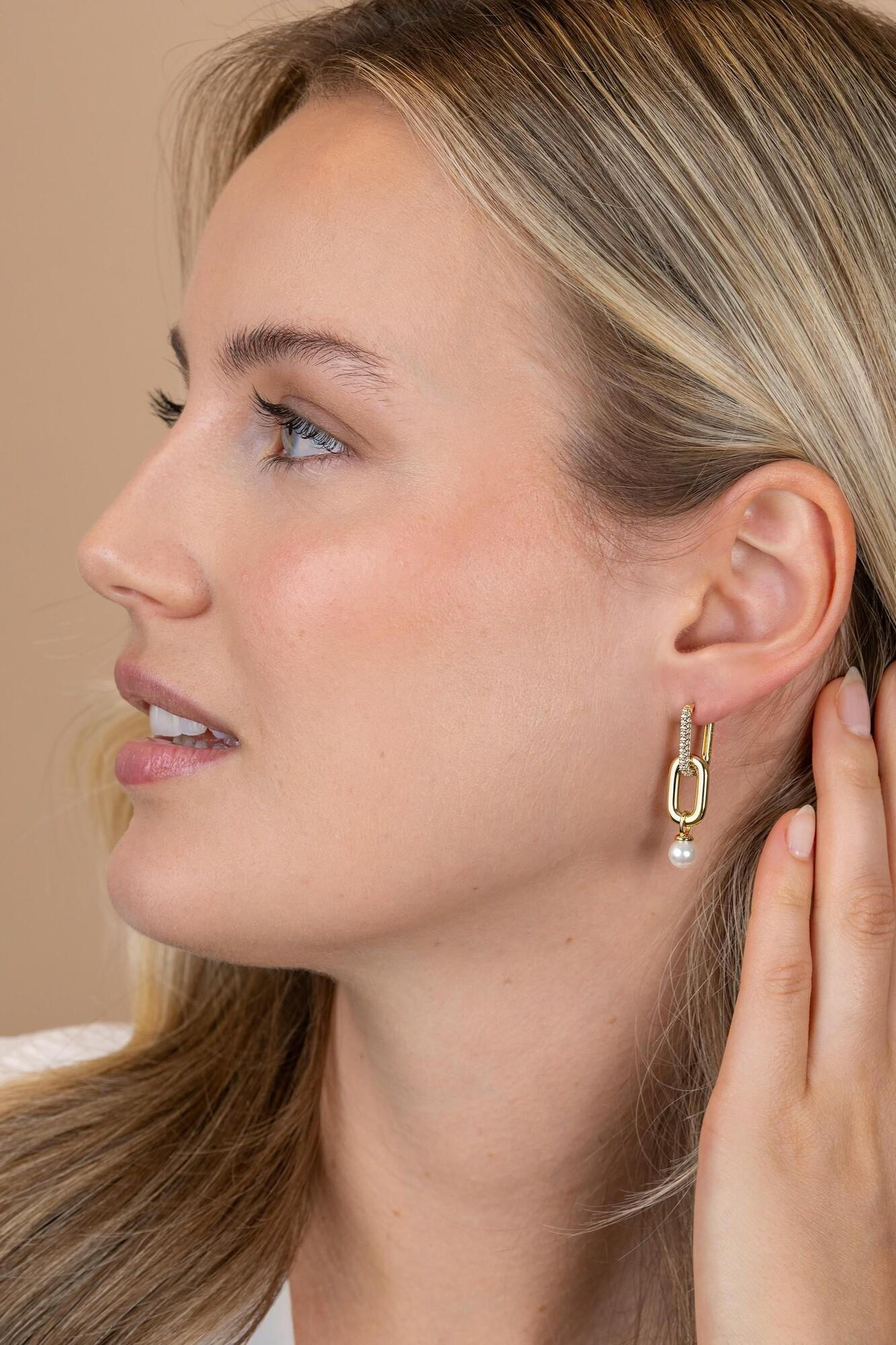 ZINZI goldplated zilveren oorbedels met een langwerpige stoere schakel (23mm) en een bungelende witte parel (6mm). De oorbedels zijn vervaardigd van eerste gehalte zilver (925) en extra geel verguld.