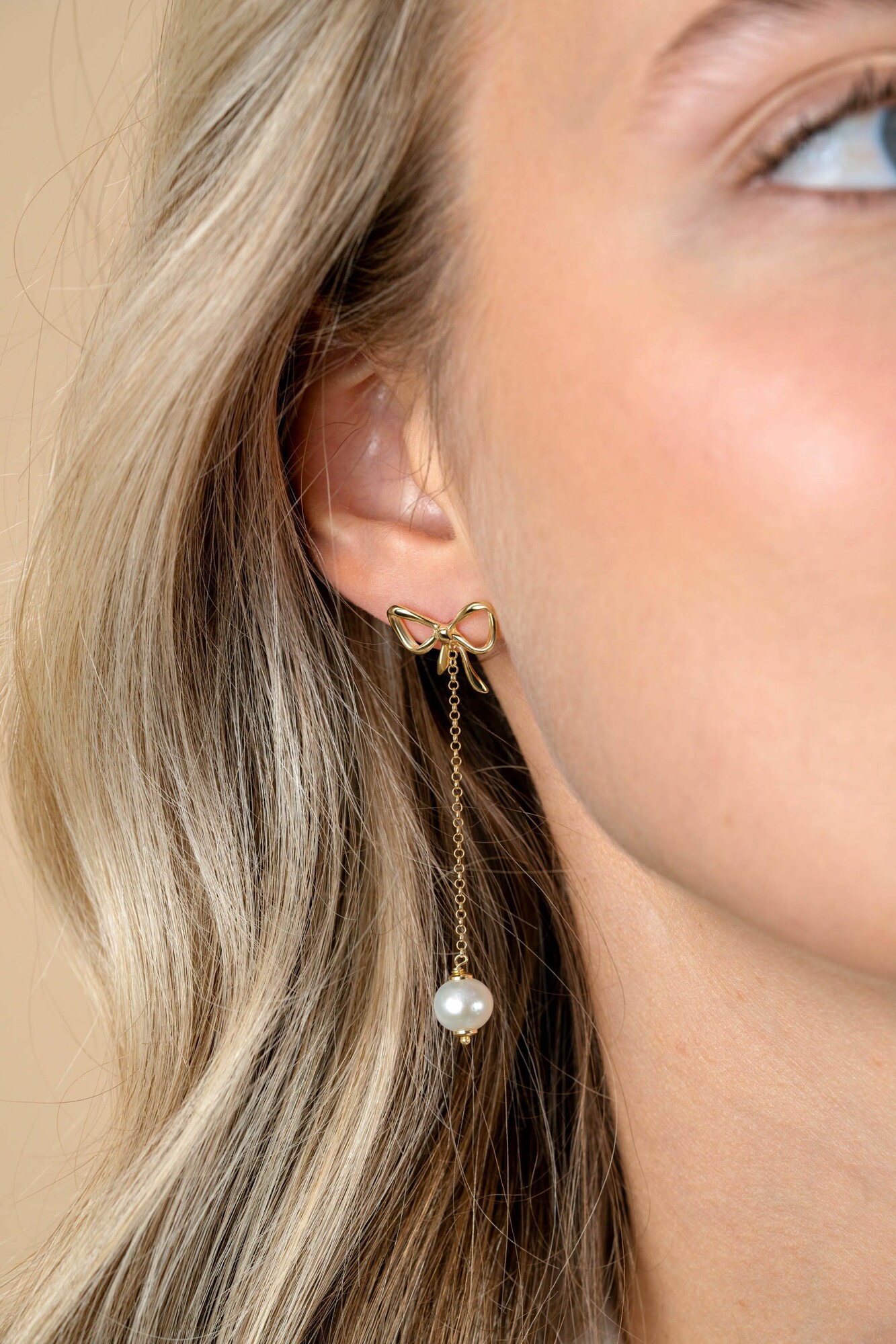 ZINZI gold plated zilveren strik oorstekers (60mm) met lang jasseron kettinkje, waaronder een ronde zoetwaterparel bungelt. Maak je look compleet met de bijpassende ketting en armband! Vervaardigd van eerste gehalte zilver (925) en extra geel verguld.