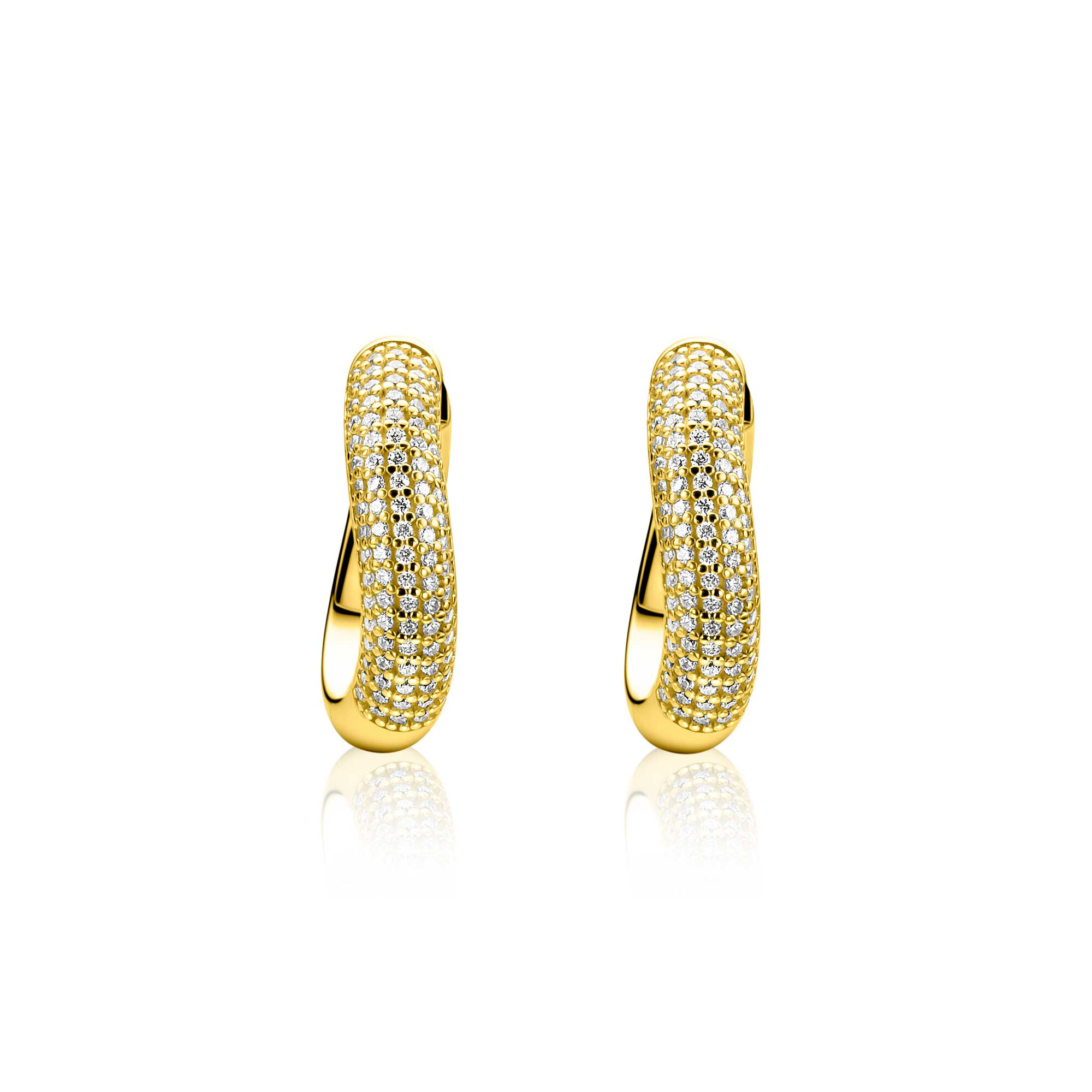 ZINZI gold plated zilveren oorringen (17mm) volledig bezet met pavé gezette witte zirkonia’s in een vloeiend lijn. Buisbreedte 4mm en met luxe klapsluiting. Vervaardigd van eerste gehalte zilver (925) en extra geel verguld.